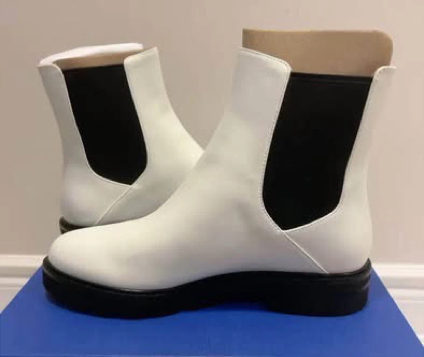 10These stylish Stuart Weitzman Chelsea boots are in great condition. They feature a sleek white design with black accents. Perfect for adding a touch of elegance to any outfit!