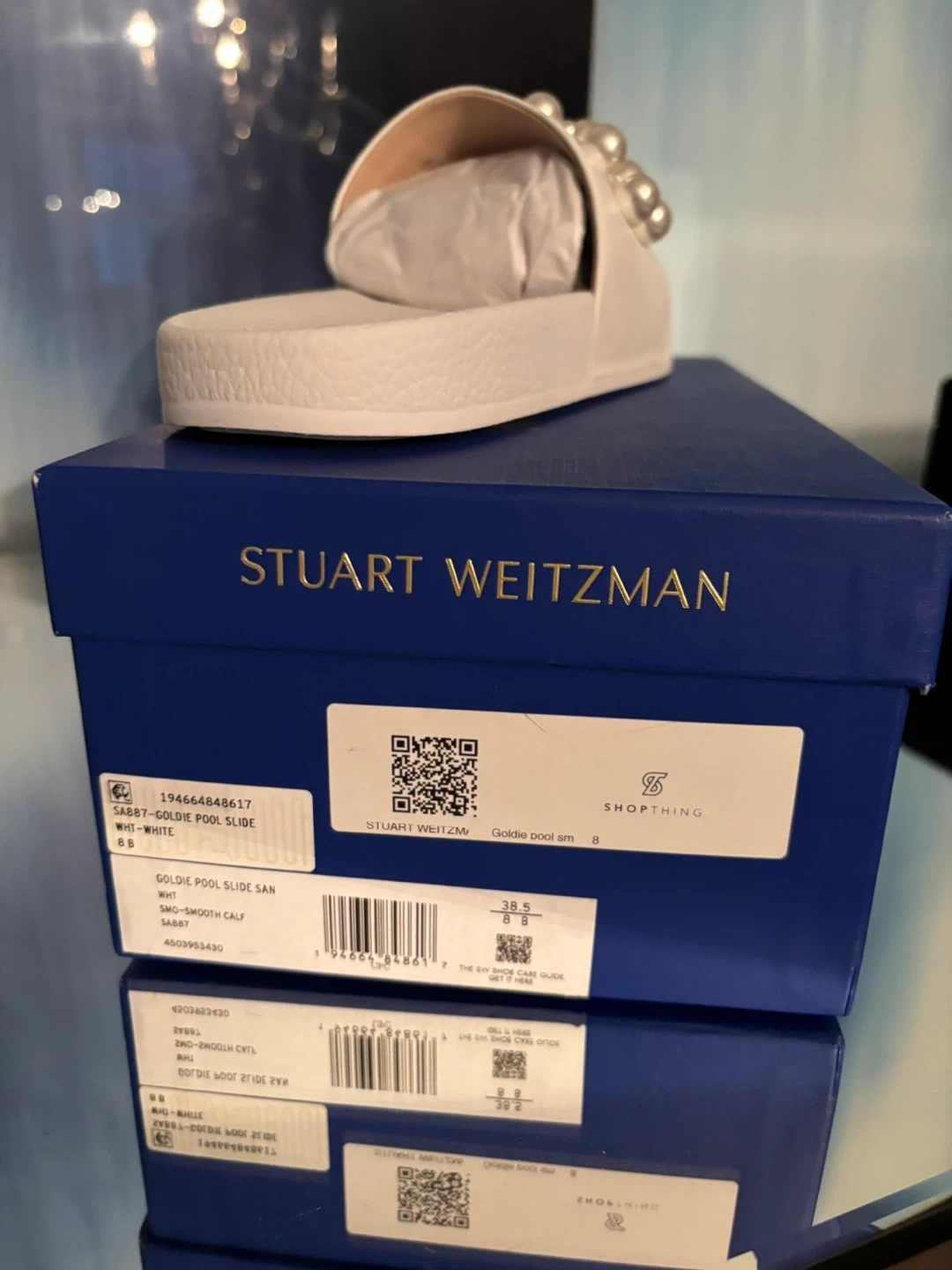 5These Stuart Weitzman Goldie Pearl Pool Slides are in great condition and come with the original box! They're a size 8 and the colour is white. These slides are perfect for adding a touch of elegance to your casual outfits