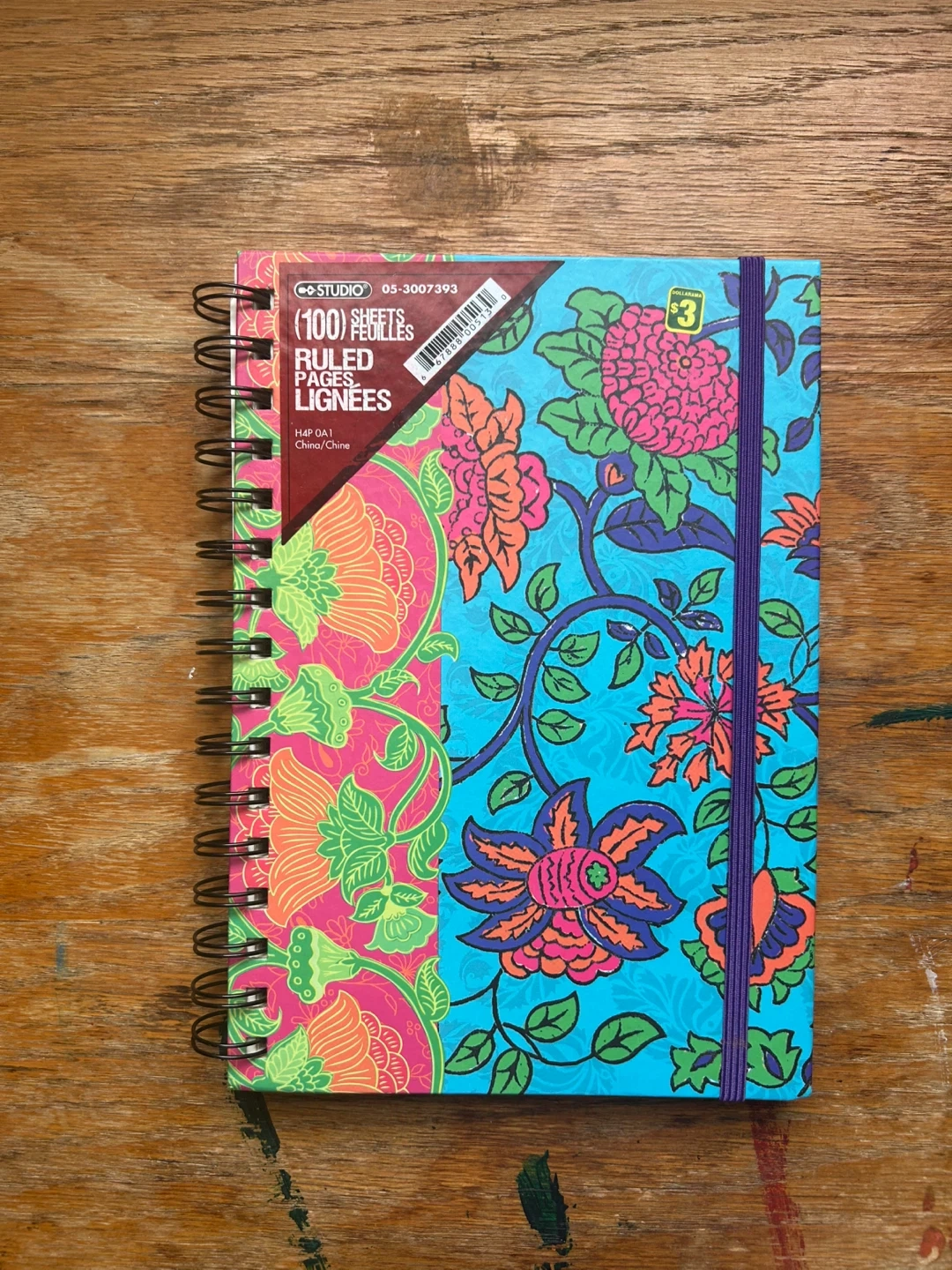 Selling a notebook from Studio with 100 ruled pages. It has a colourful floral design and an elastic closure. Great for taking notes or journaling
