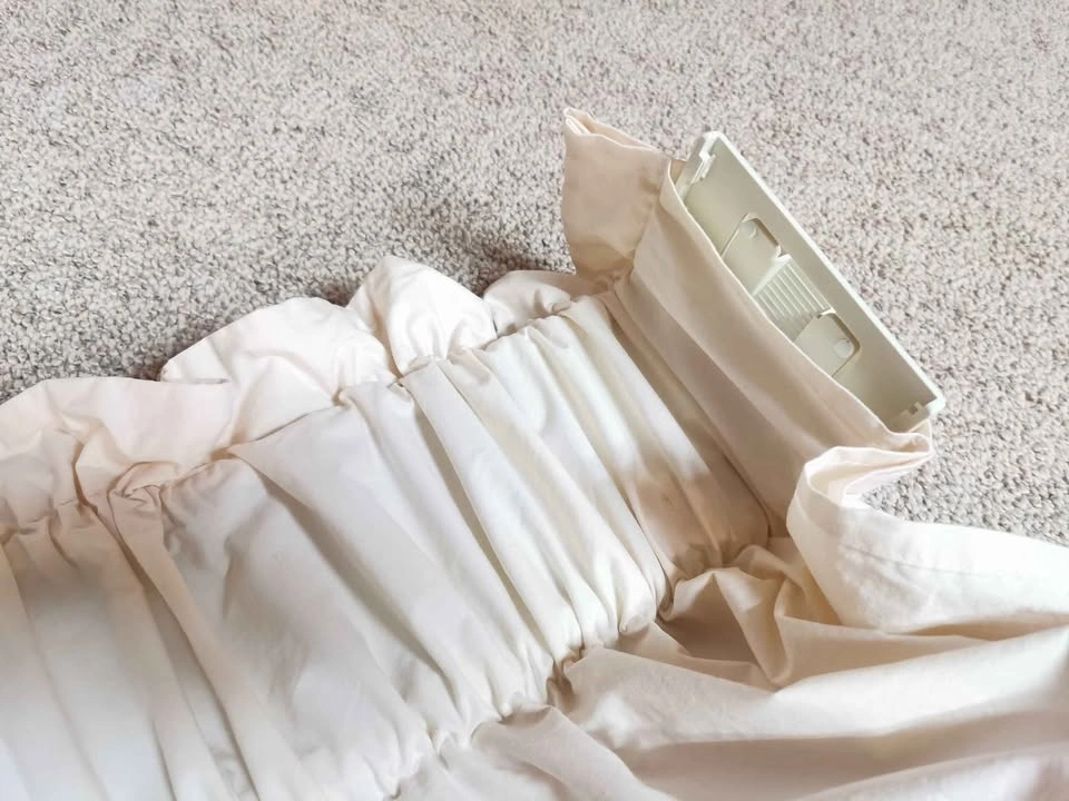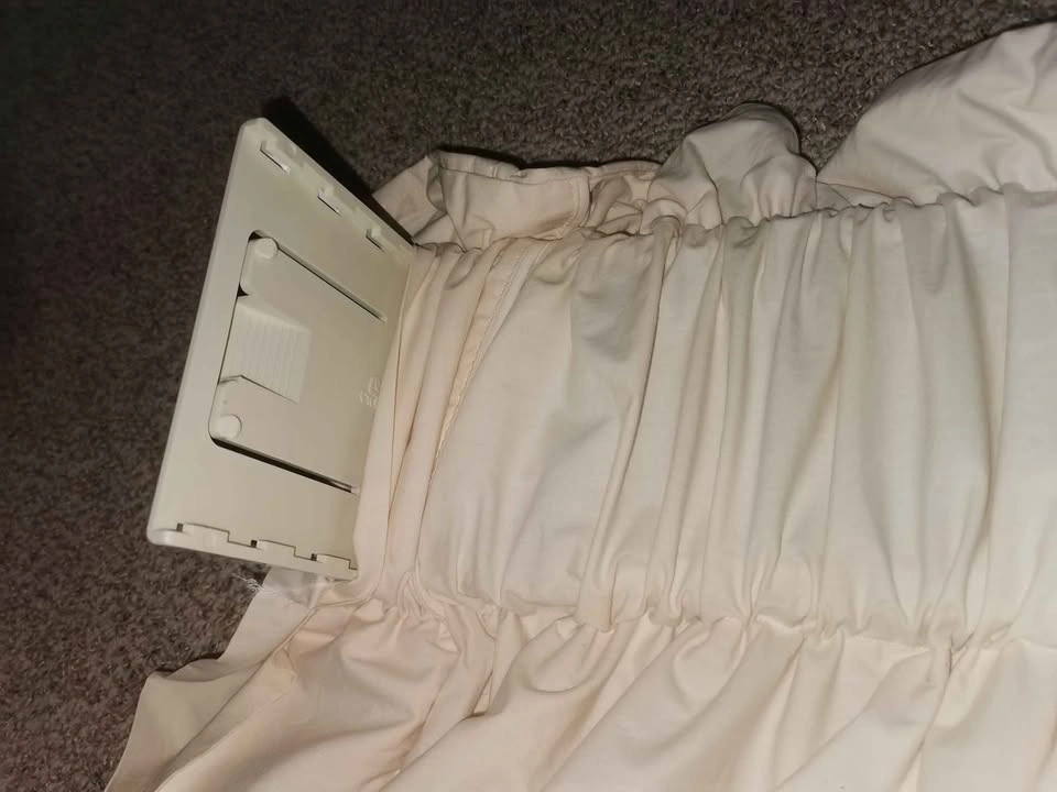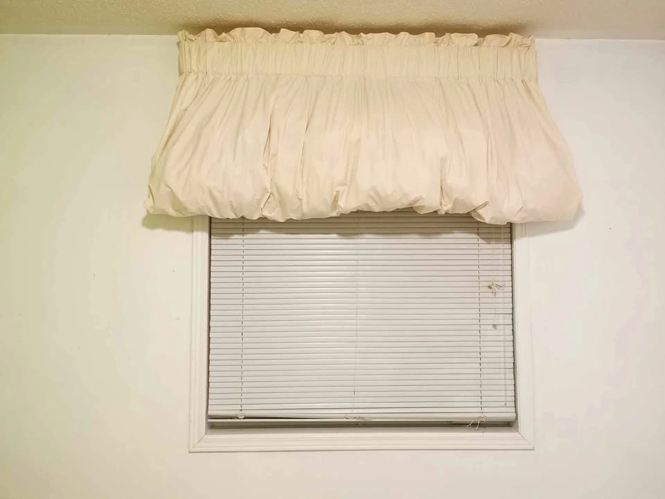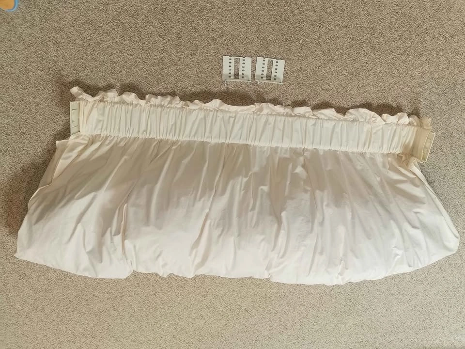 15- Graber custom balloon cloud curtain valance stuffed so it stays poofy. - Was installed above 47" wide window per photo. - Cream or light beige color. - Includes original adjustable depth (closer or further in relation to window frame) sturdy metal mounting brackets and nails. - Gently used and like almost new with no rips or stains. Ever so slight piling shown in the photos. - Pet and smoke free home. - E-transfer or cash.
