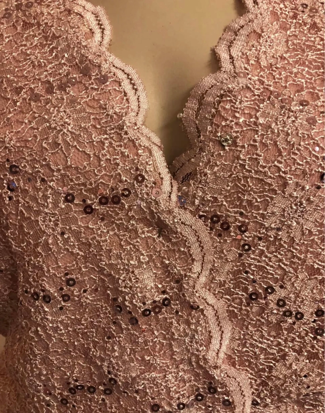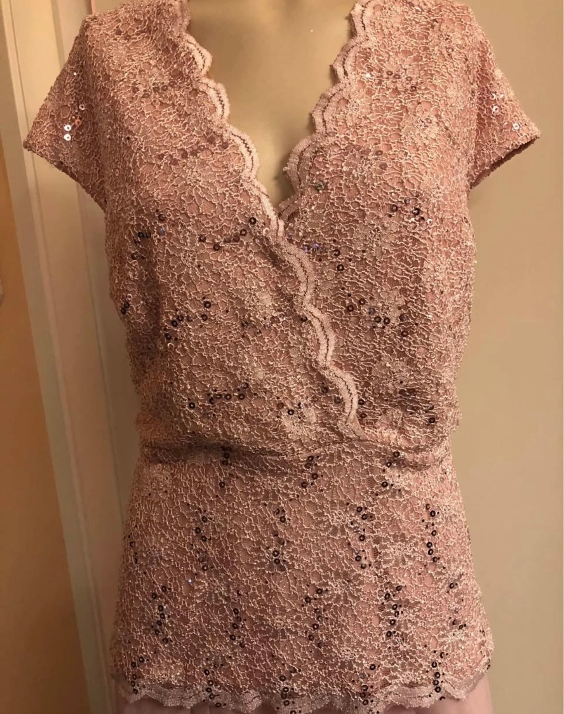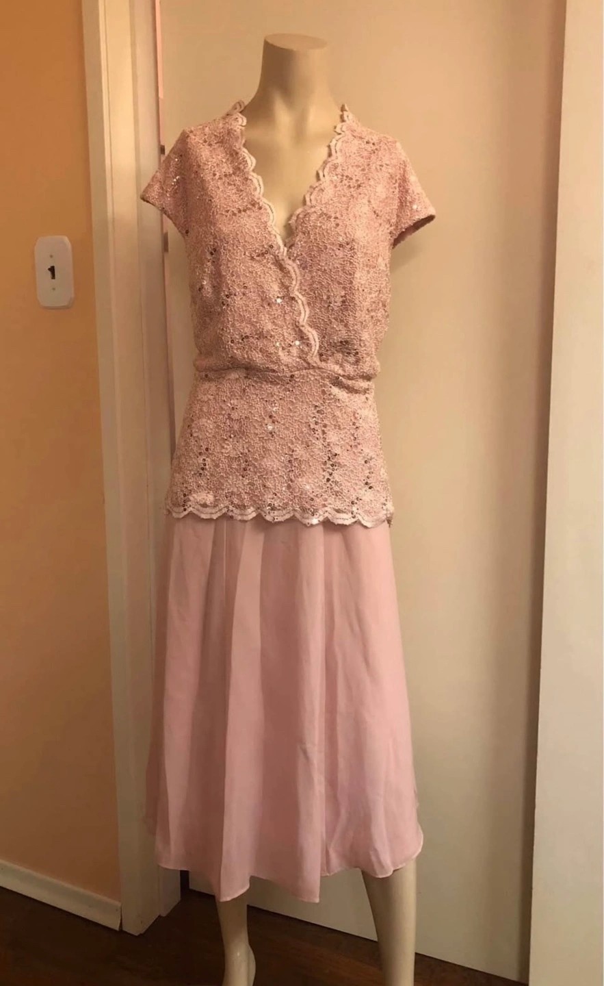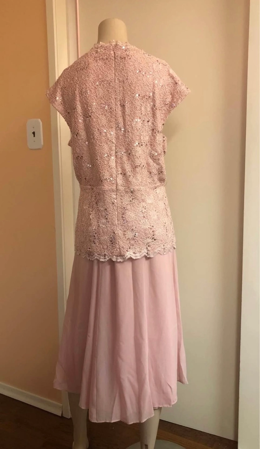 374Beautiful blush pink dress, two-piece design. Sequined lace top, flowy chiffon skirt. Perfect for a special occasion.