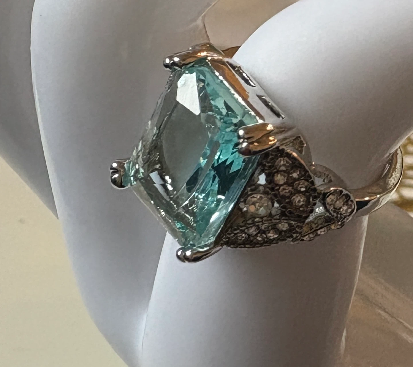 242A Stunning Sterling Silver Ring featuring a large, rectangular blue stone. It's surrounded by smaller, clear stones that add a touch of sparkle. Perfect for adding a pop of colour to any outfit!