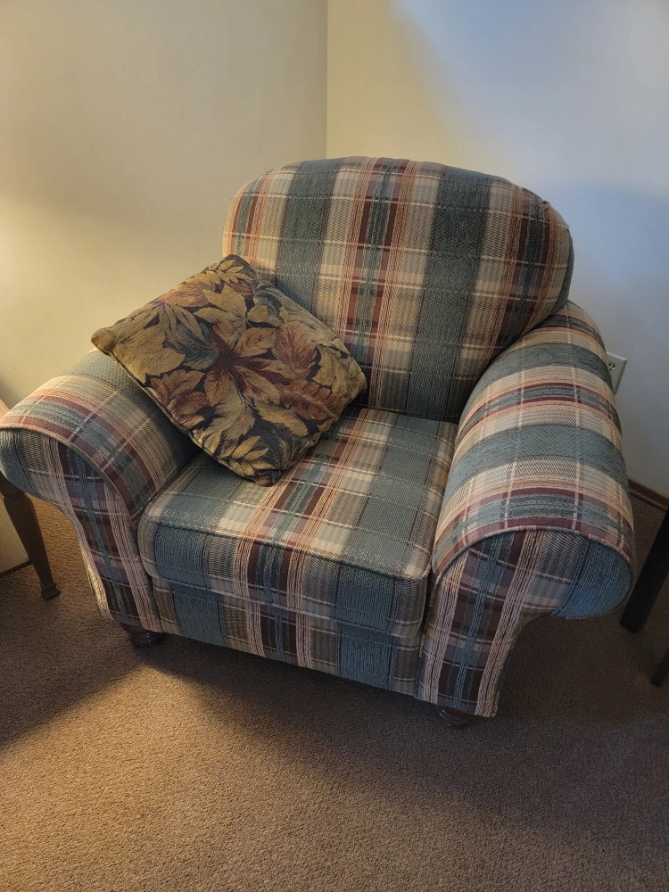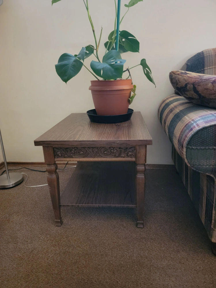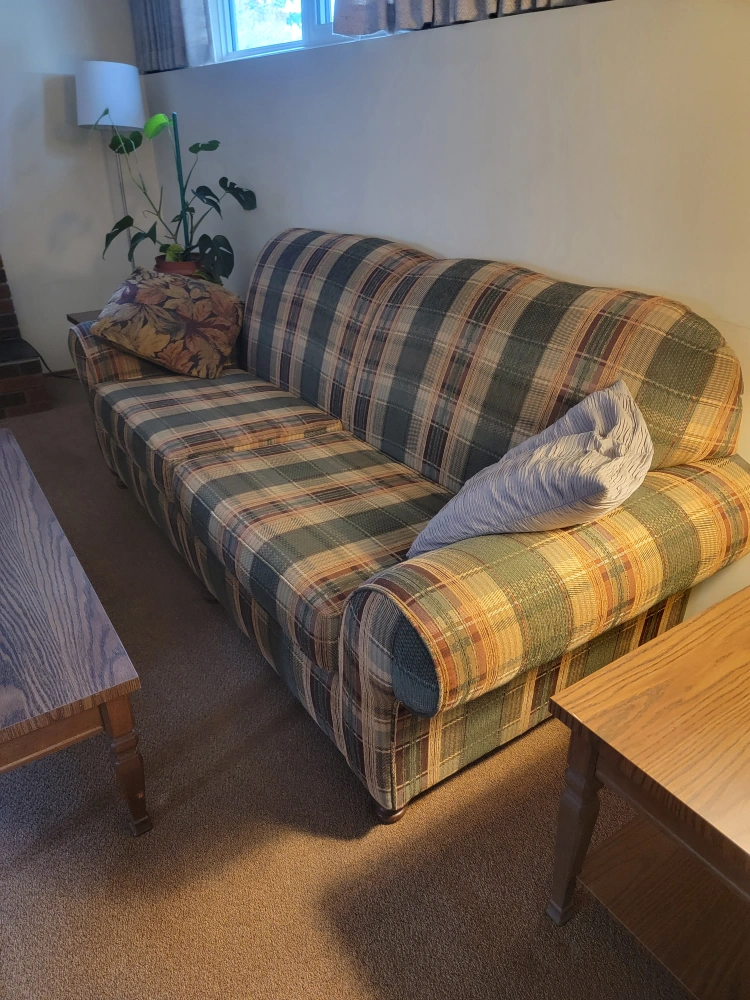 30Country cottage couch measures 7 ft x 3 ft x 3 ft. the matching chair measures 3 ft x 43 in x 3 ft. The end tables feature carving on one side. See if you can find an ottoman like this for under $80! The coffee table is also included. We will sell individually if we cannot sell the set. WILL NOT fit in an SUV, just in case you ask.