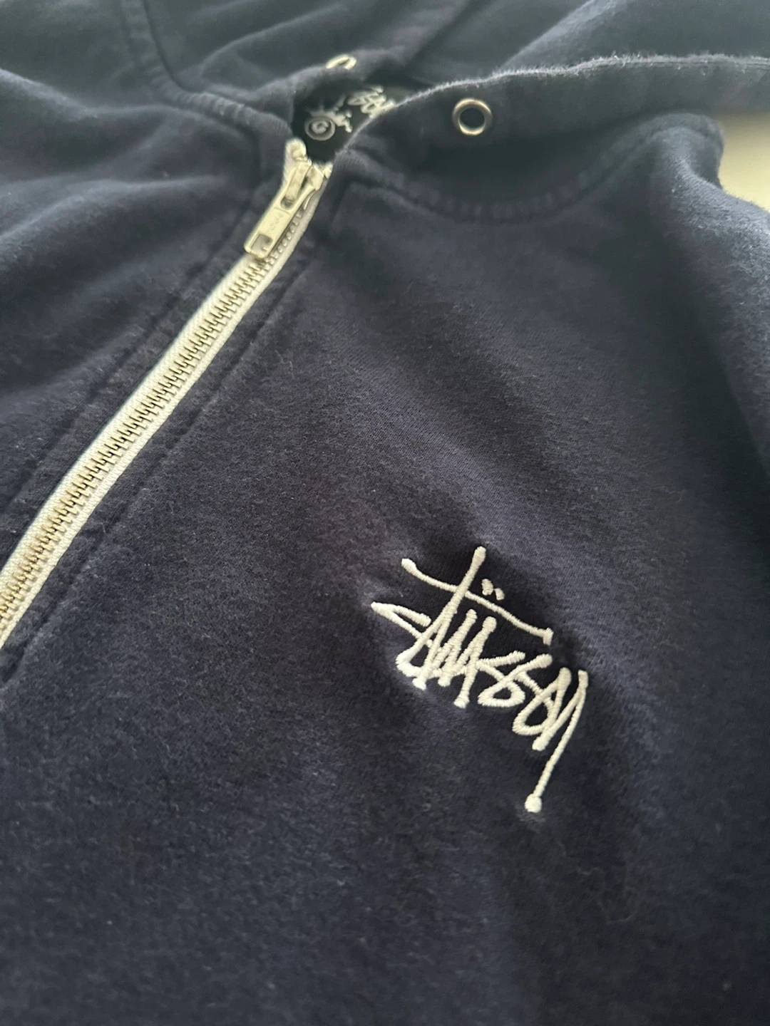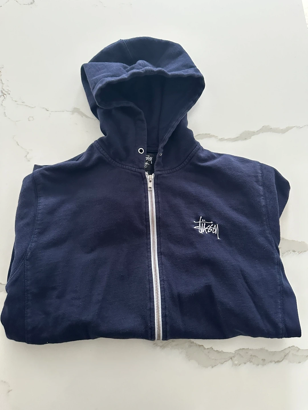 Selling a Stussy full zip hoodie in size large! It's a nice navy blue colour with the classic Stussy logo on the front. Great for layering or wearing on its own. Fits small to size.
