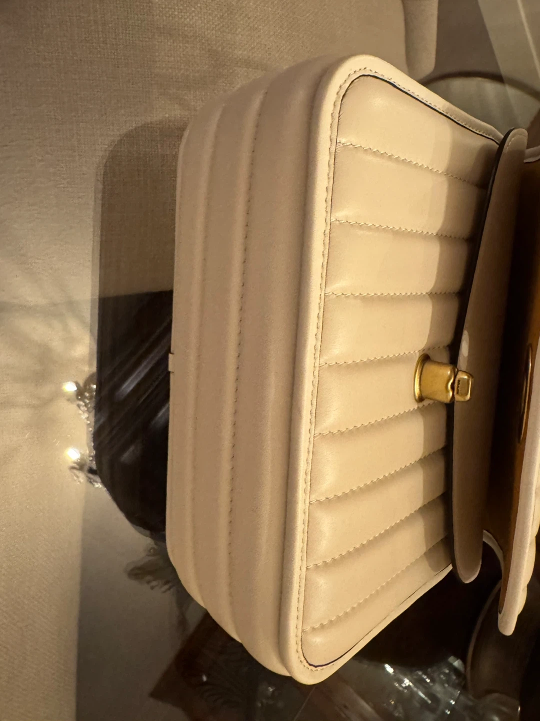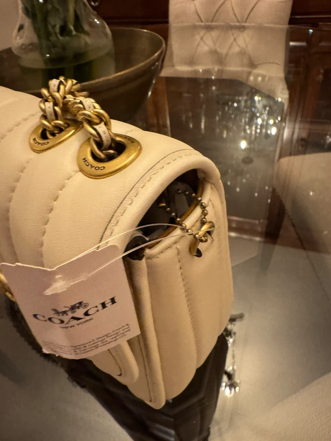 Stylish cream leather shoulder bag from Coach. It features a quilted design with a secure turn-lock closure and a versatile chain strap. This bag is perfect for carrying your essentials on the go.