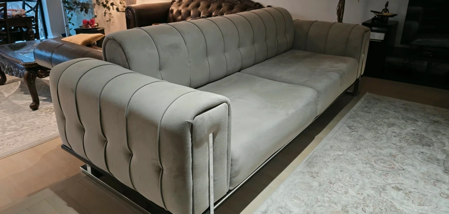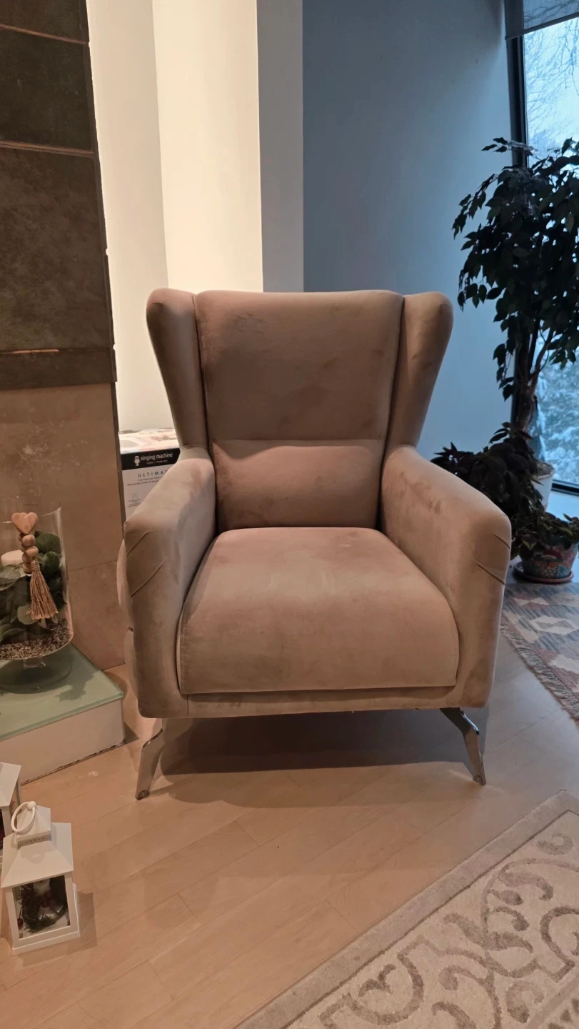10This is an elegant furniture set, including a three-seater sofa and a matching wingback armchair, both upholstered in a soft, light taupe or beige velvet/velour fabric. Fabric: Soft, plush velvet or velour in a neutral tone. Sofa Design: The sofa has a tufted or channeled design on the back and arms, giving it a structured, sophisticated look. Armchair Design: The armchair is a classic wingback style, often called a slipper chair or accent chair, offering a traditional silhouette. Bases/Legs: Both pieces are supported by sleek metal legs or bases, likely chrome or polished steel, which adds a contemporary flair. ⭕️Condition Note: The sofa currently has a broken internal wood structure that is noted as repairable.⭕️ ⭕️The color for both is the color of first and second slide, just the different lighting⭕️
