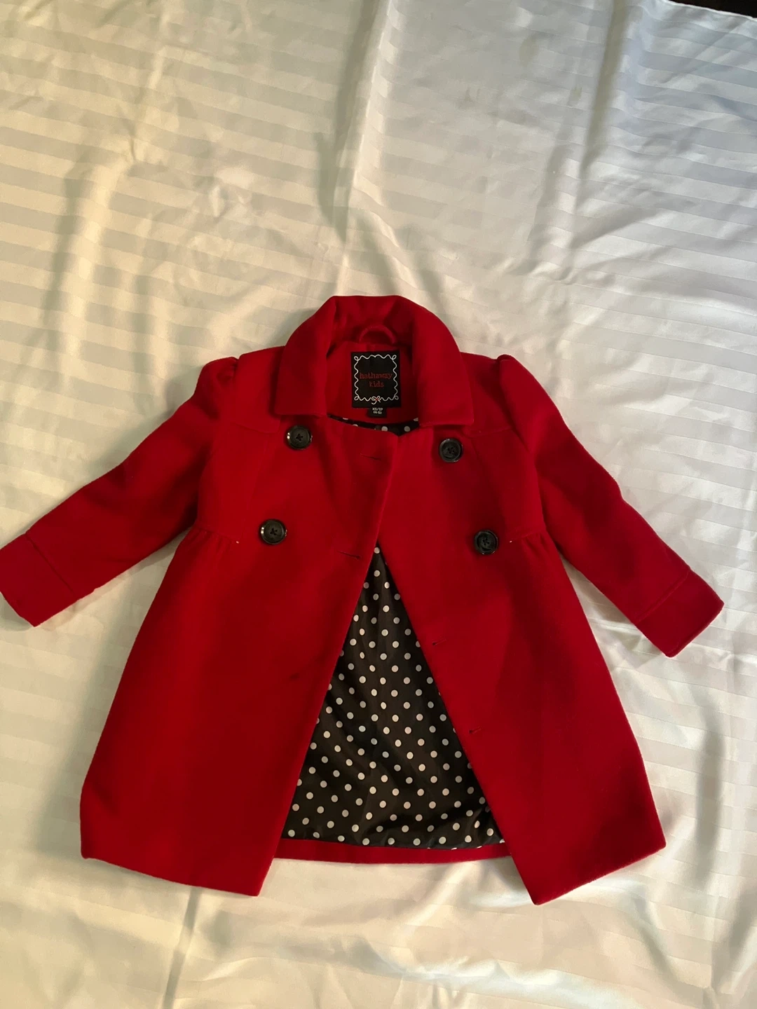 21A cute red coat from Hathaway Kids in size XS (4-5)! It's perfect for keeping your little one warm and stylish. The coat featuresy a double-breasted design with black buttons and a fun polka dot lining.
