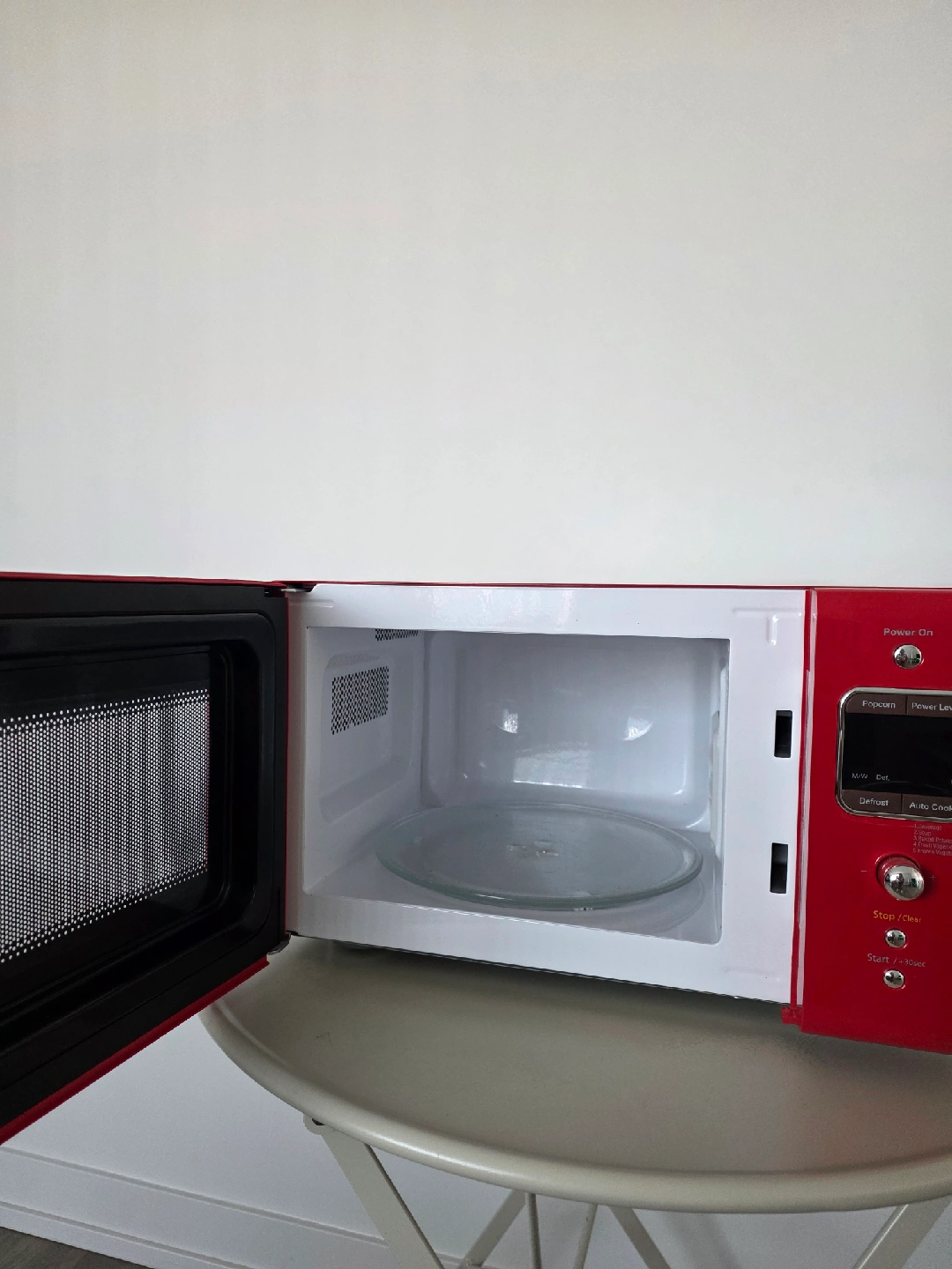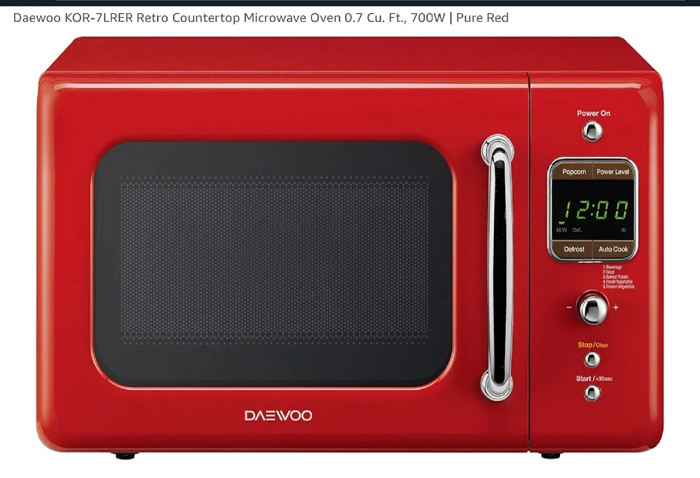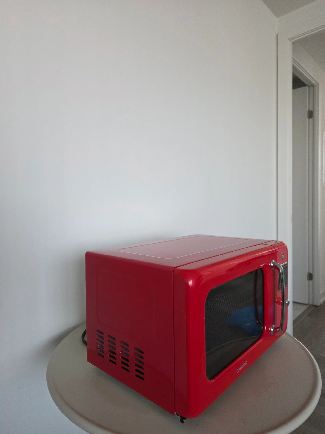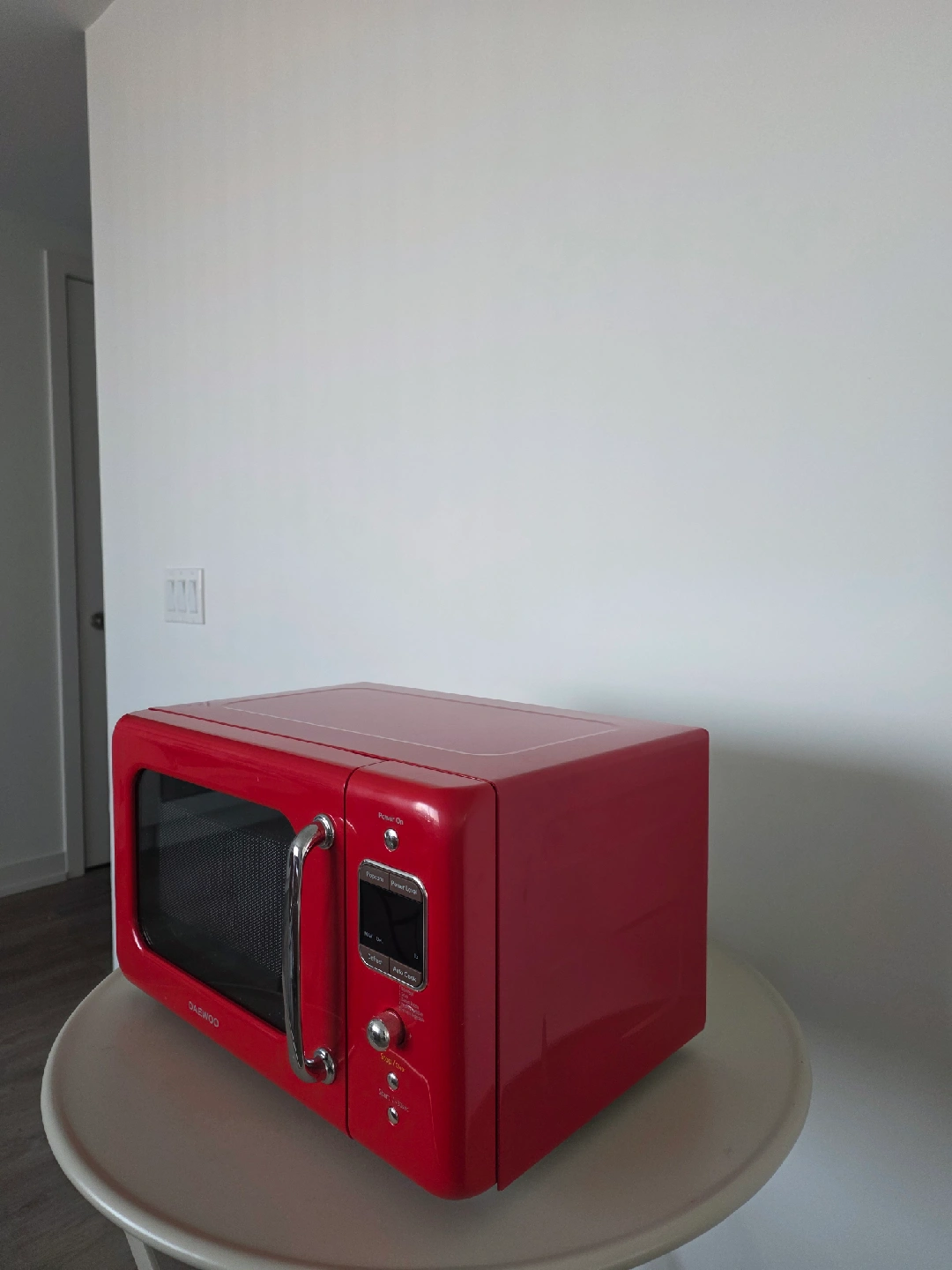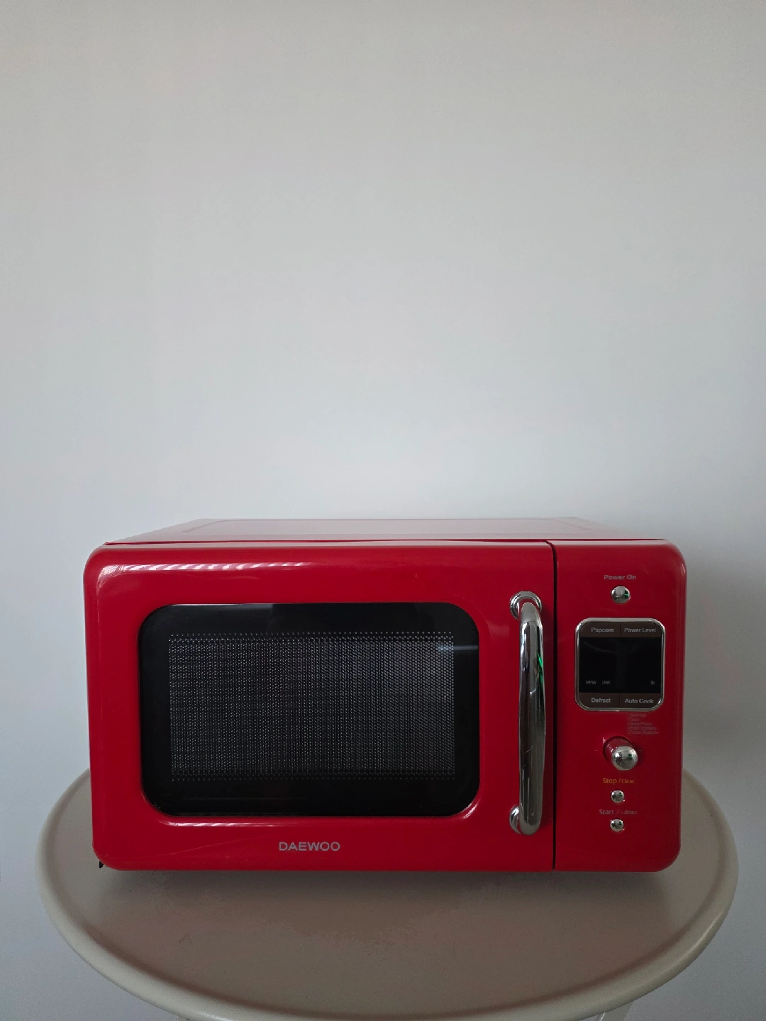Selling a Daewoo retro countertop microwave oven in a vibrant red colour! It's in great condition and ready for a new home. This microwave is perfect for adding a touch of vintage charm to your kitchen. It has a 0.7 cu. ft. capacity and 700W power. The model number is KOR-7LRER.