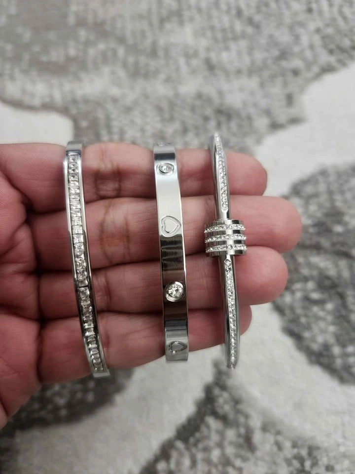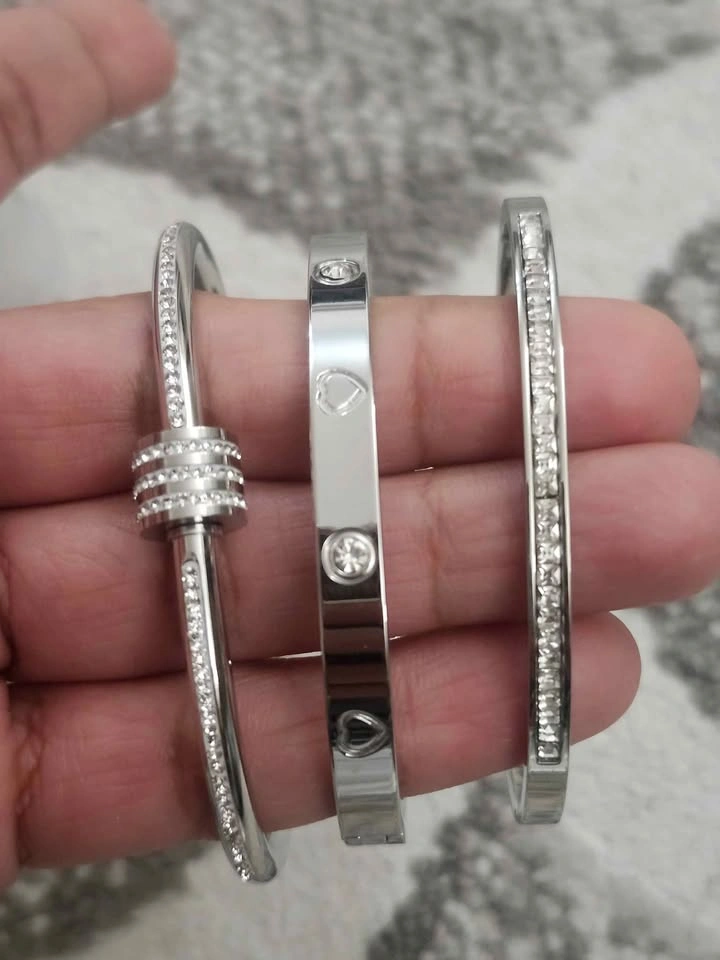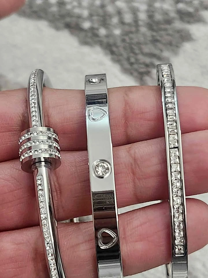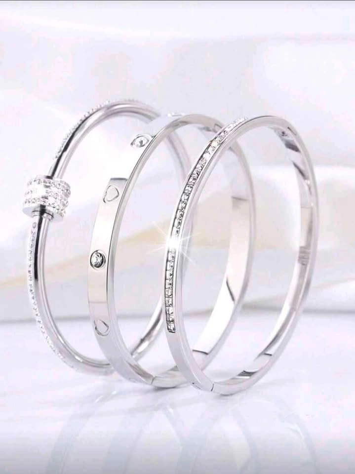 189Add a touch of glamour to any look with this set of three elegant silver bangles. Each bracelet features sparkling crystal accents, perfect for parties or daily wear. Condition: Brand new, never worn Color: Silver with clear crystal accents Includes: 3 individual bangles (sold as a set) Design: Two slim crystal-lined bangles and one cuff with heart and crystal motifs Style: Modern, chic – perfect for stacking or wearing solo Ideal for: Gift or adding sparkle to your own collection Price: $25 Pickup locations: Brock Road & Pickering Parkway, Pickering Message for more info or to arrange pickup!