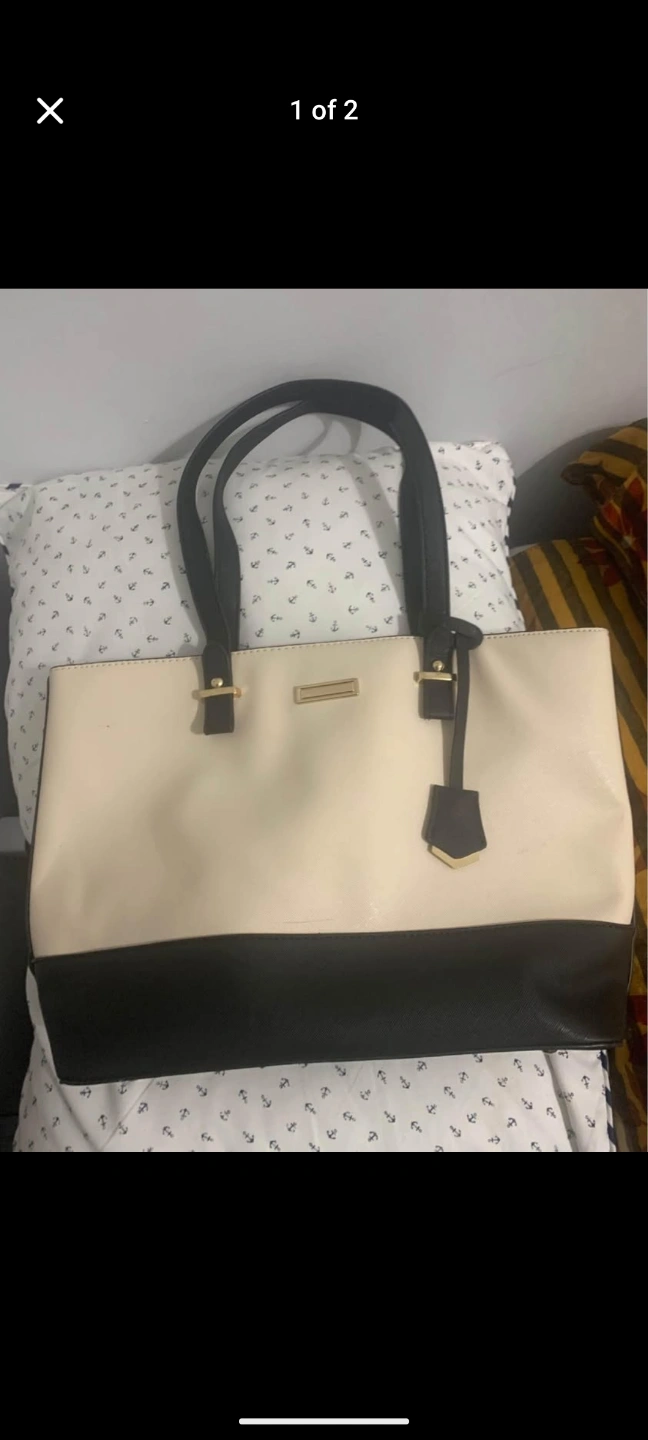 48Large tote bag. Two-tone design, cream and black. Top handles. Gold-toned hardware. Zip closure. Roomy interior.
