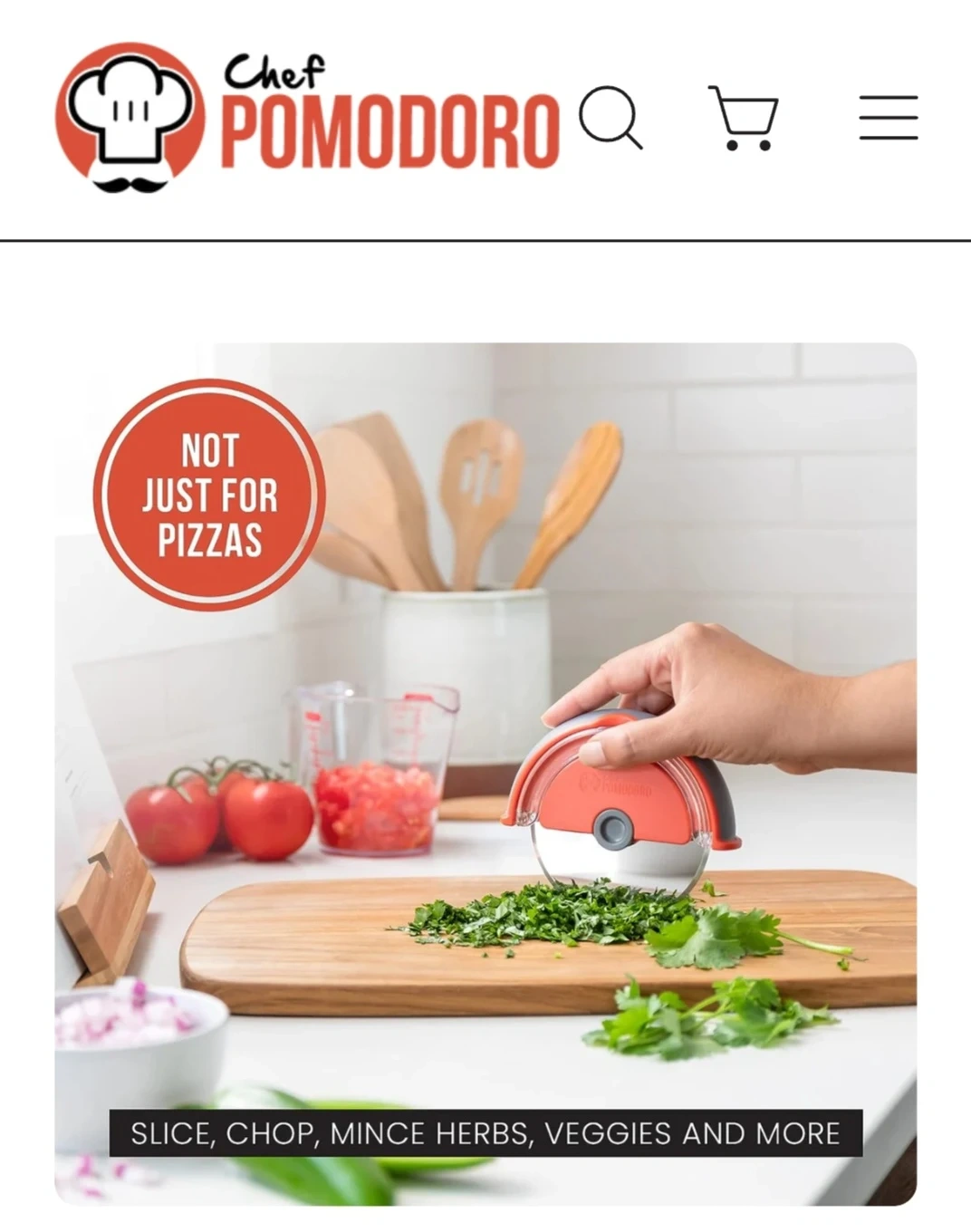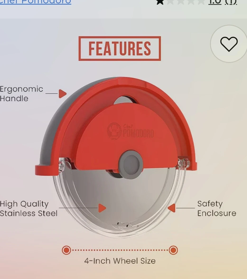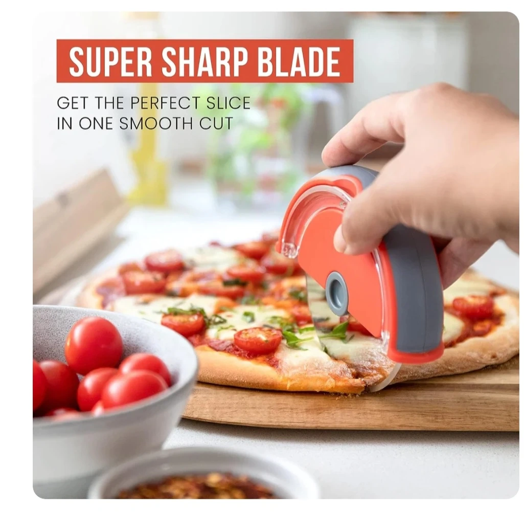 This Chef Pomodoro pizza cutter features a super sharp stainless steel blade and an ergonomic handle. It's great for slicing pizzas, but also chops and minces herbs and veggies. Includes a safety enclosure for worry-free use!