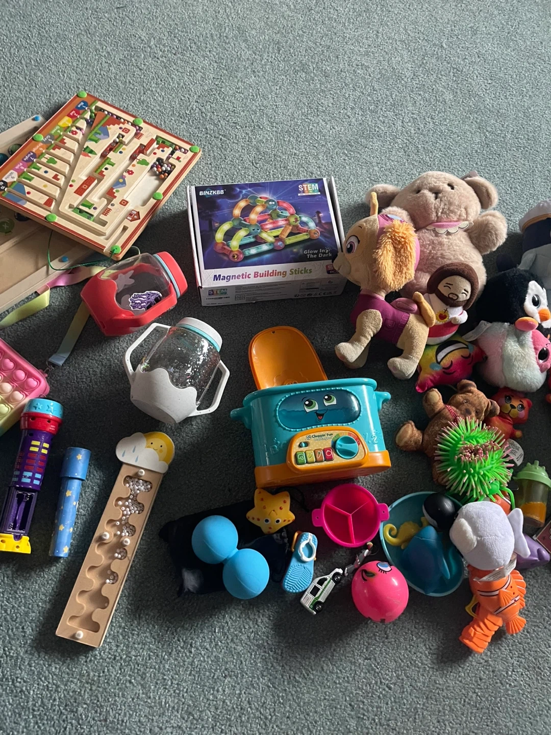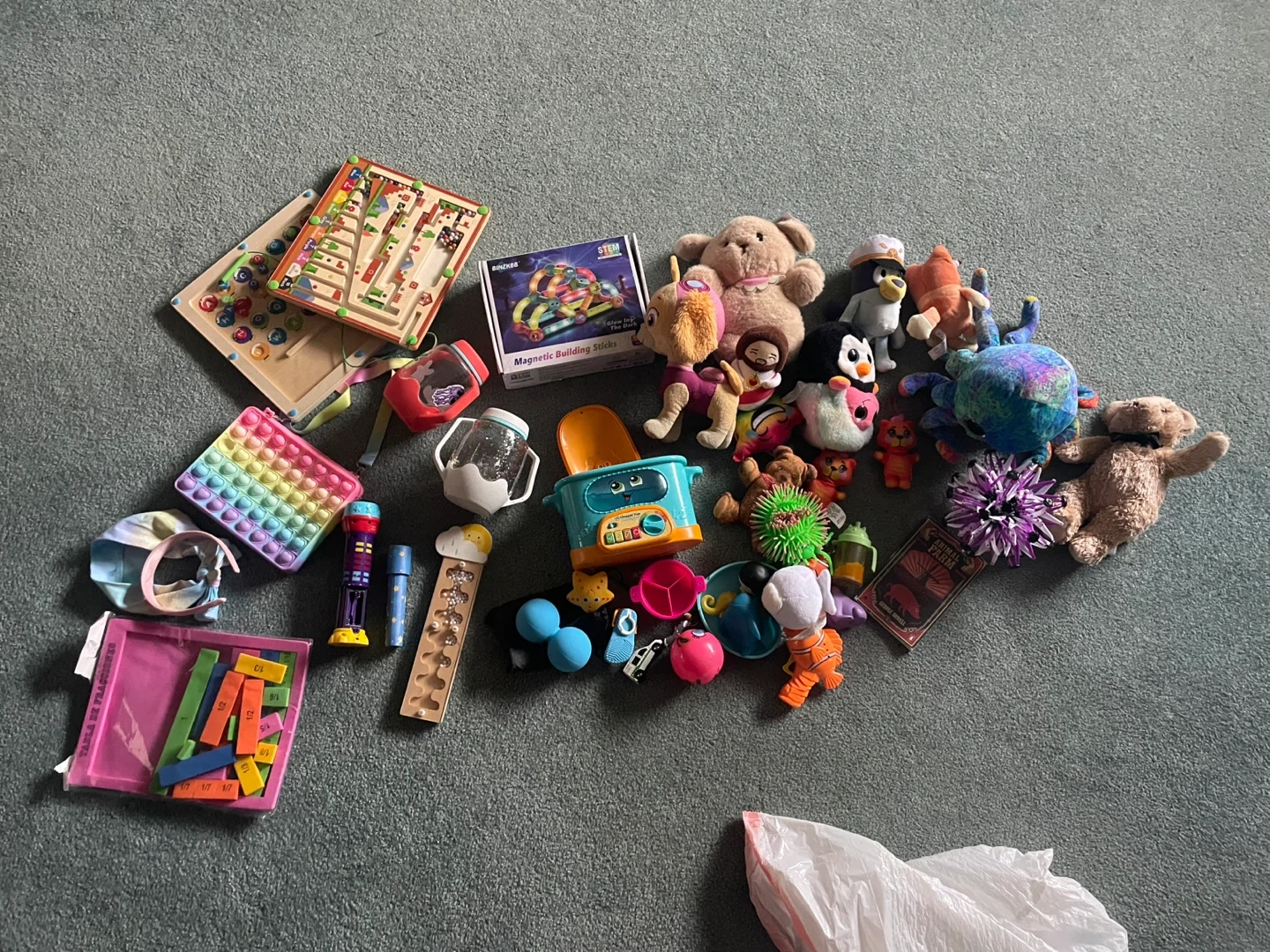 A fun collection of toys including plush animals, a magnetic building sticks set, and various other play items. Perfect for toddlers and young children! Includes a pop-it fidget toy and a wooden maze game.
