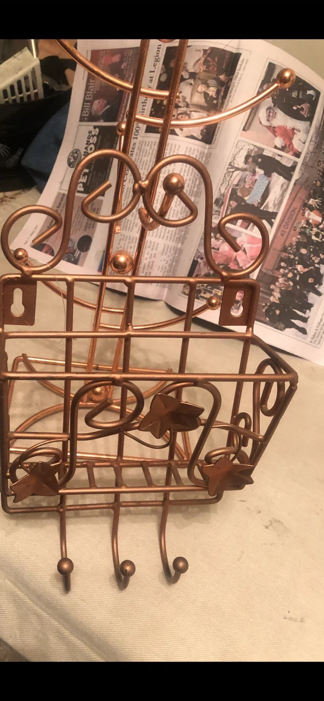 This set includes a copper-finished mug tree with hooks for mugs and a matching napkin holder. It's a nice way to organize your kitchen counter or dining table.