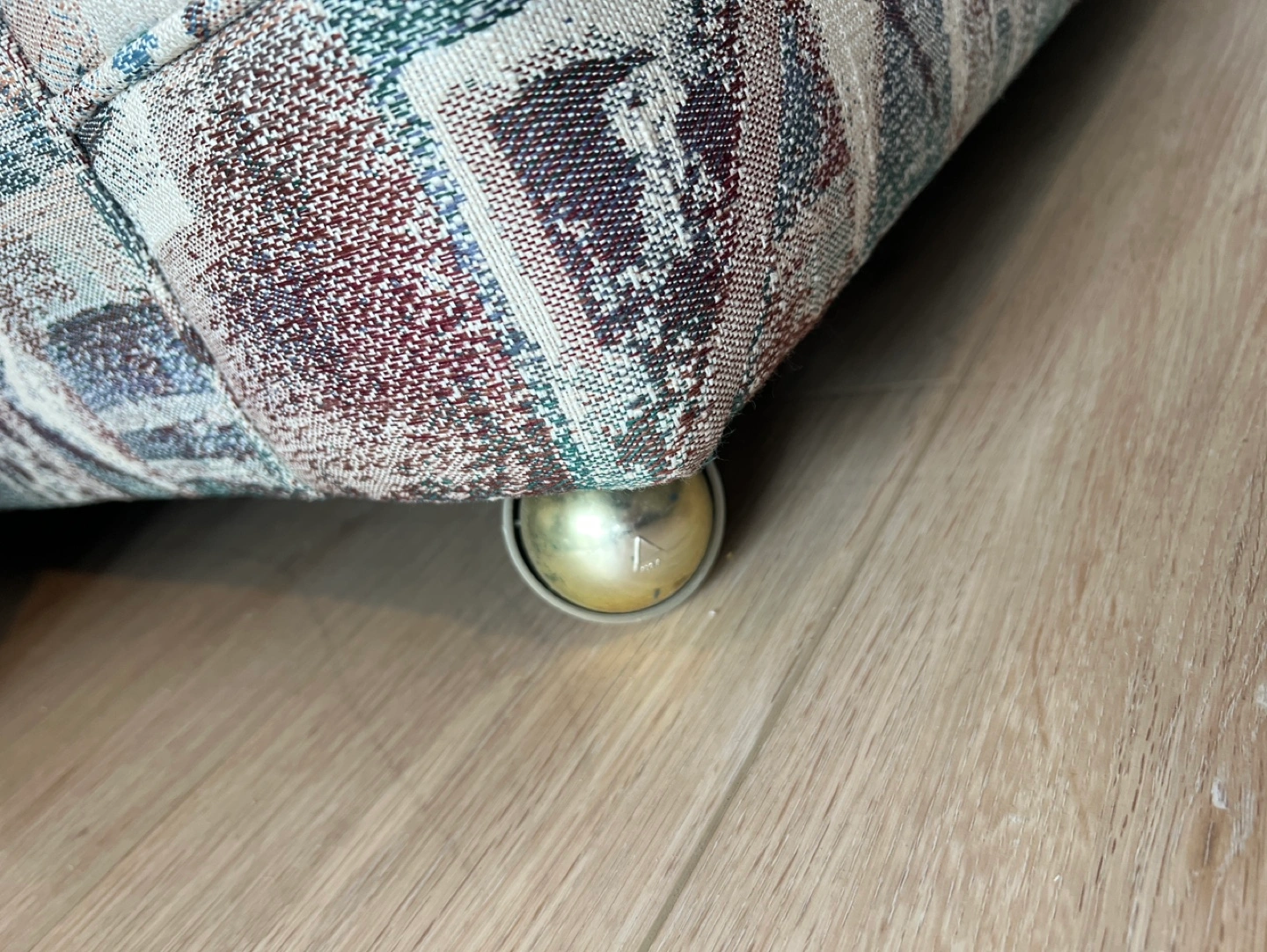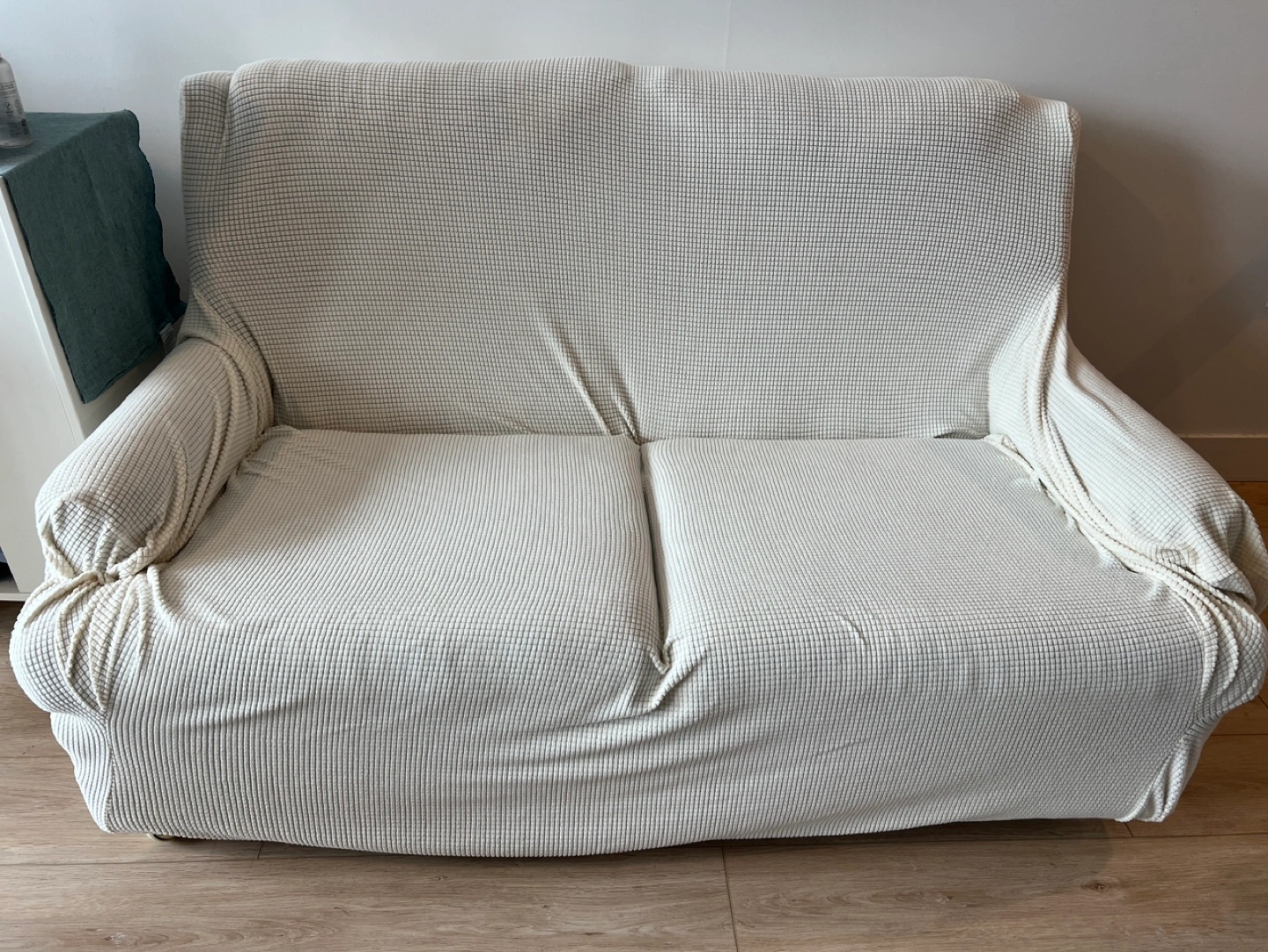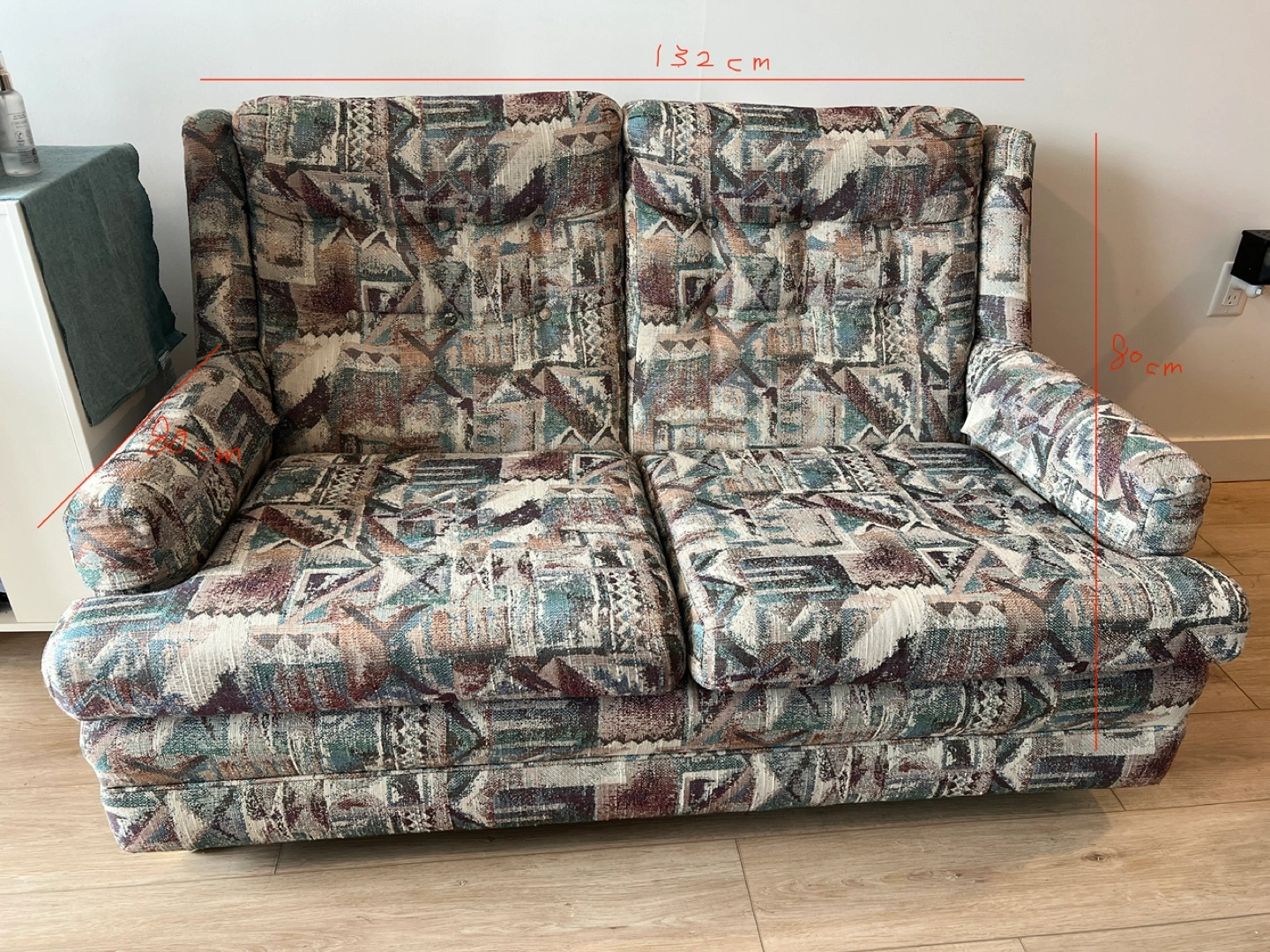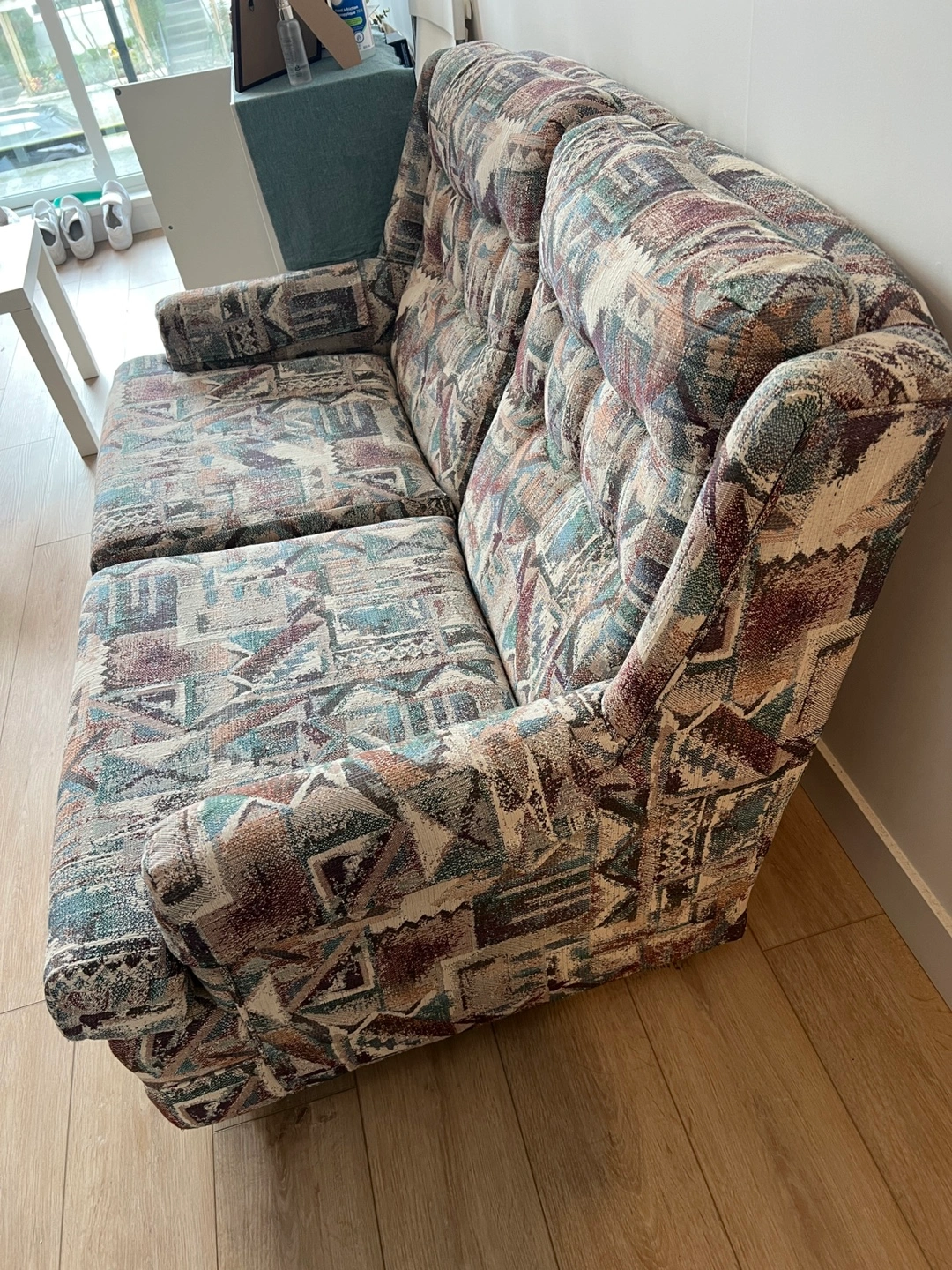 Loveseat sofa with a multicoloured geometric pattern. It's 132 cm wide and 80 cm high. Includes a fitted cream-coloured slipcover for $100. Not includes the slipcover for free.