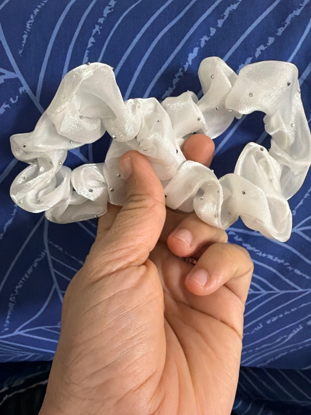 Two shimmery white scrunchies adorned with small rhinestones. These fabric hair ties offer a bit of sparkle and hold hair securely. They're great for adding a touch of glam to everyday hairstyles or for dressing up an outfit!