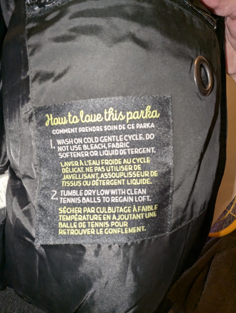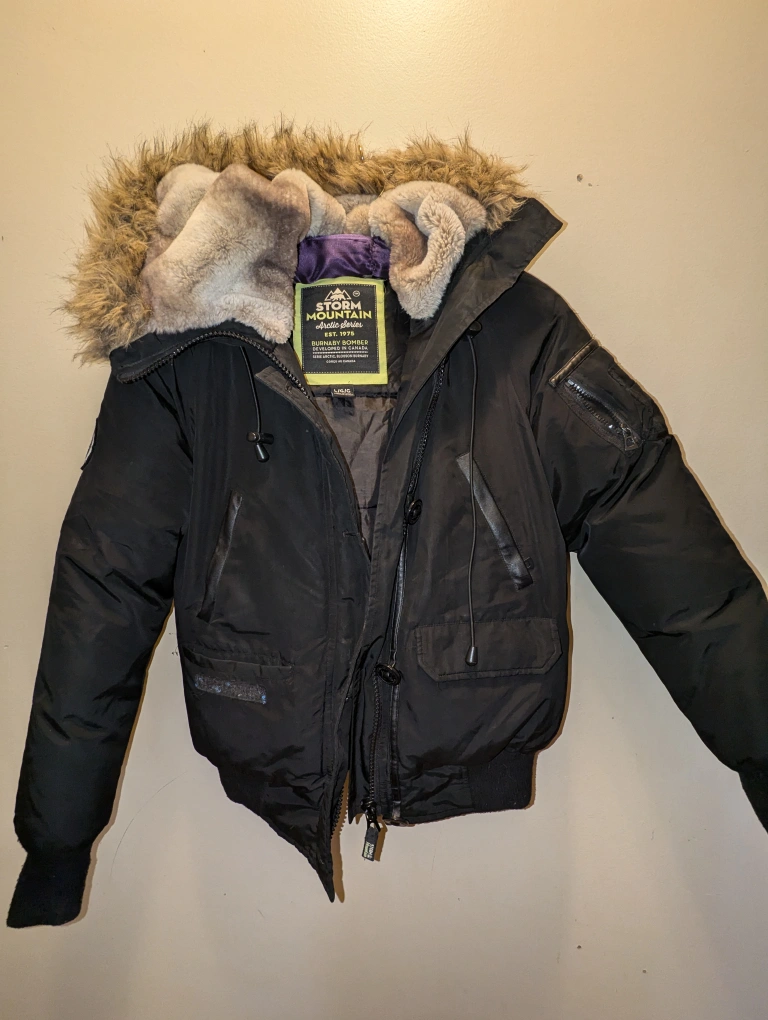 This is a very warm & comfortable jacket it has 50% feather & 50% down filling. The hood has a really warm fuzzy lined hood. I bought this last season & only wore one season
