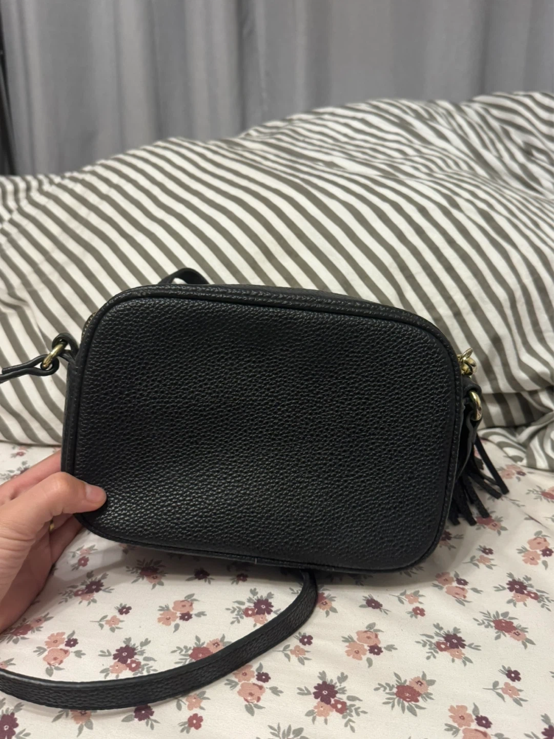 This is a black pebbled leather Gucci camera bag. It features the iconic interlocking G logo embossed on the front and a tassel detail on the zipper. Leather interior.