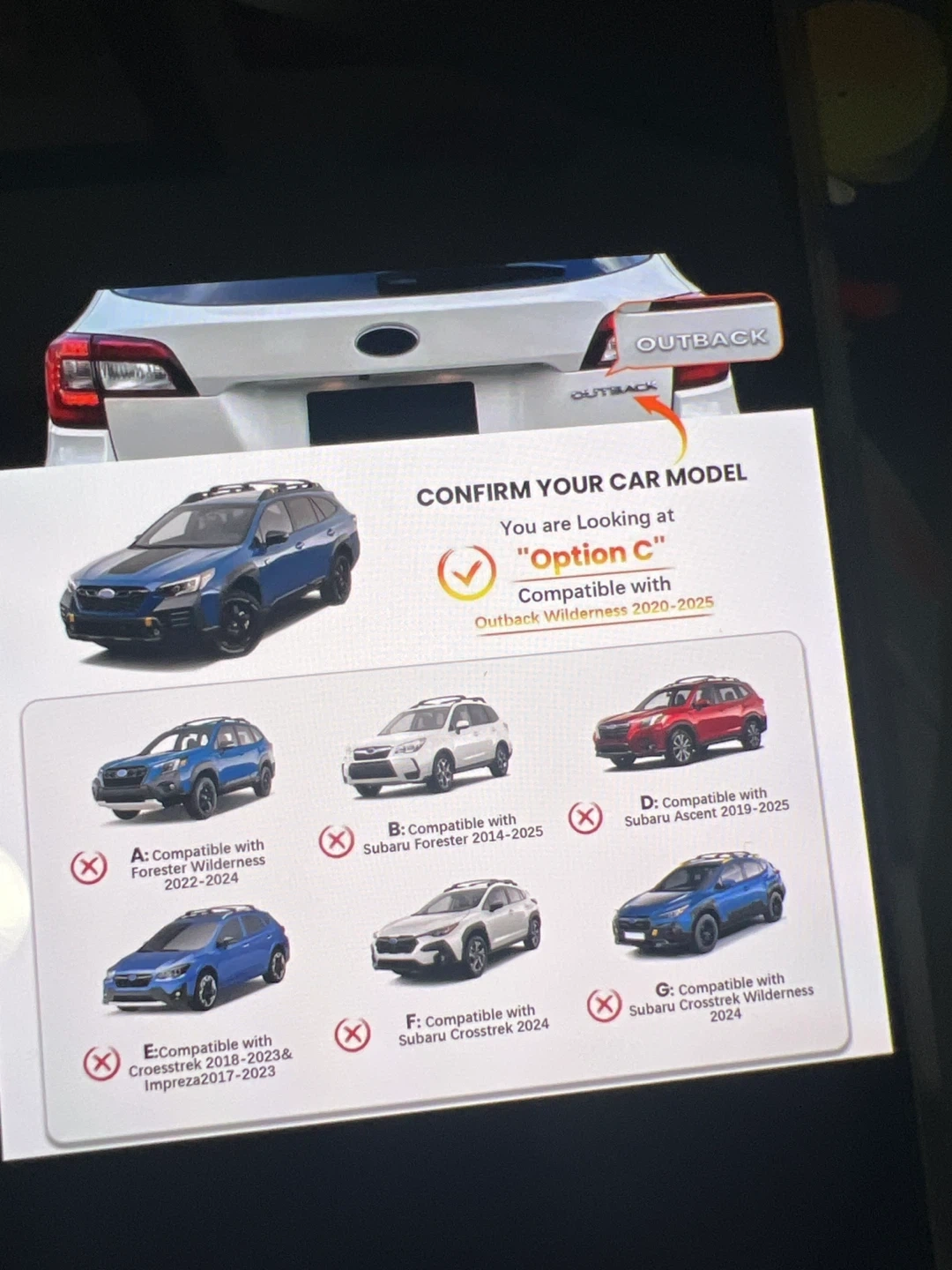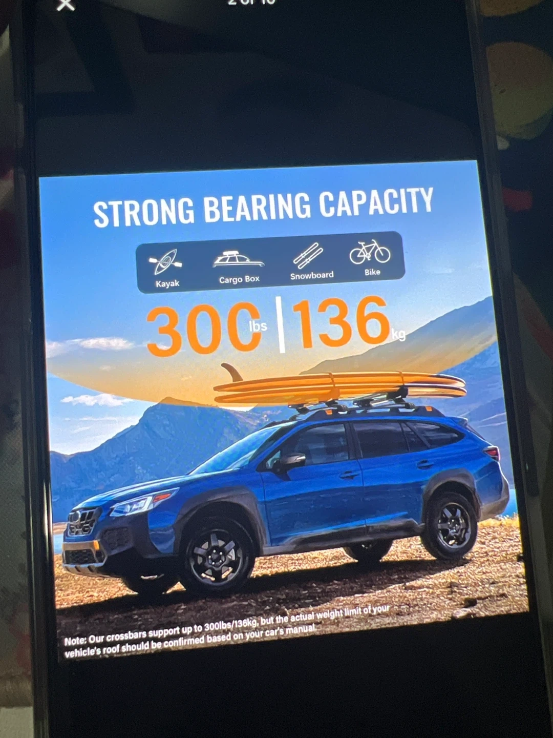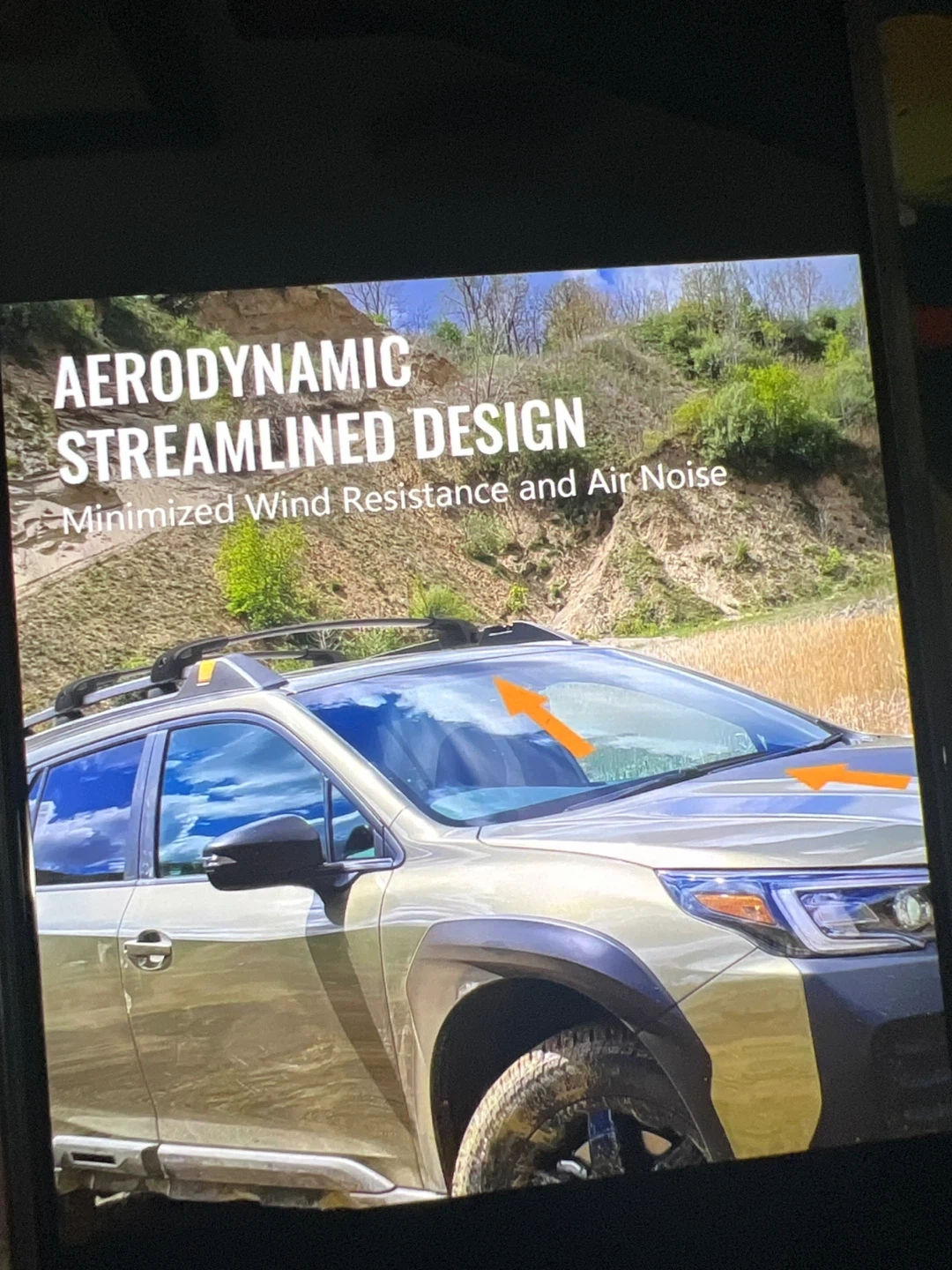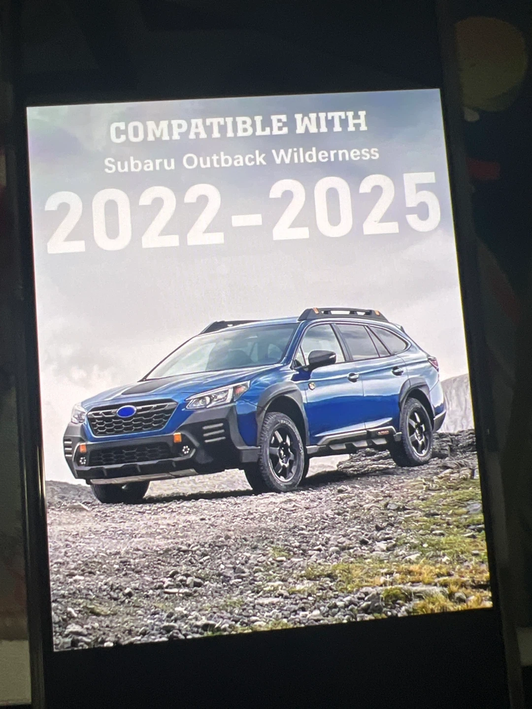 60Selling a roof rack compatible with the Subaru Outback Wilderness models from 2022 to 2025! The rack is designed with an aerodynamic, streamlined design to minimize wind resistance and air noise. It also provides you with security with an anti-theft lock. The crossbars support up to 300 lbs / 136 kg.