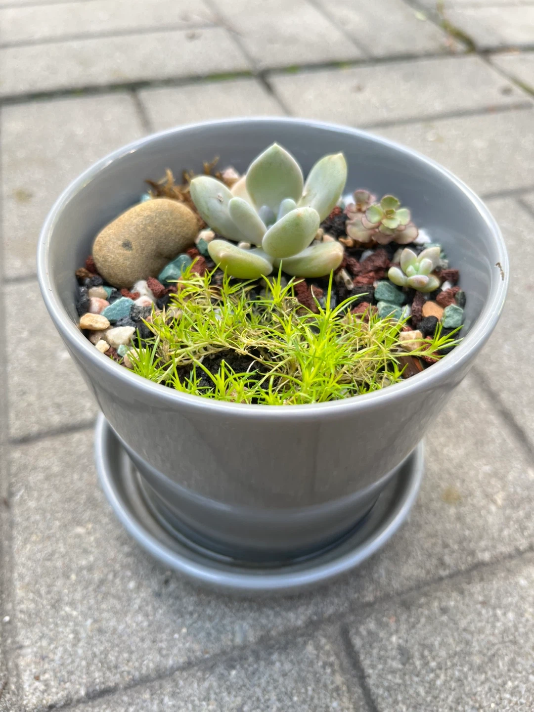A cute little succulent arrangement in a grey pot(comes with saucer)! It's perfect for adding a touch of green to your home or office. It's in great condition and ready to brighten up any space