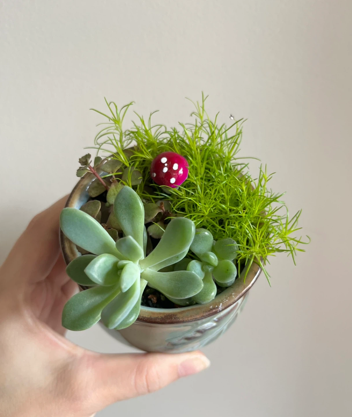 A cute little succulent arrangement in a decorative pot! It includes a variety of succulents and a charming mushroom decoration to add a touch of whimsy to any space