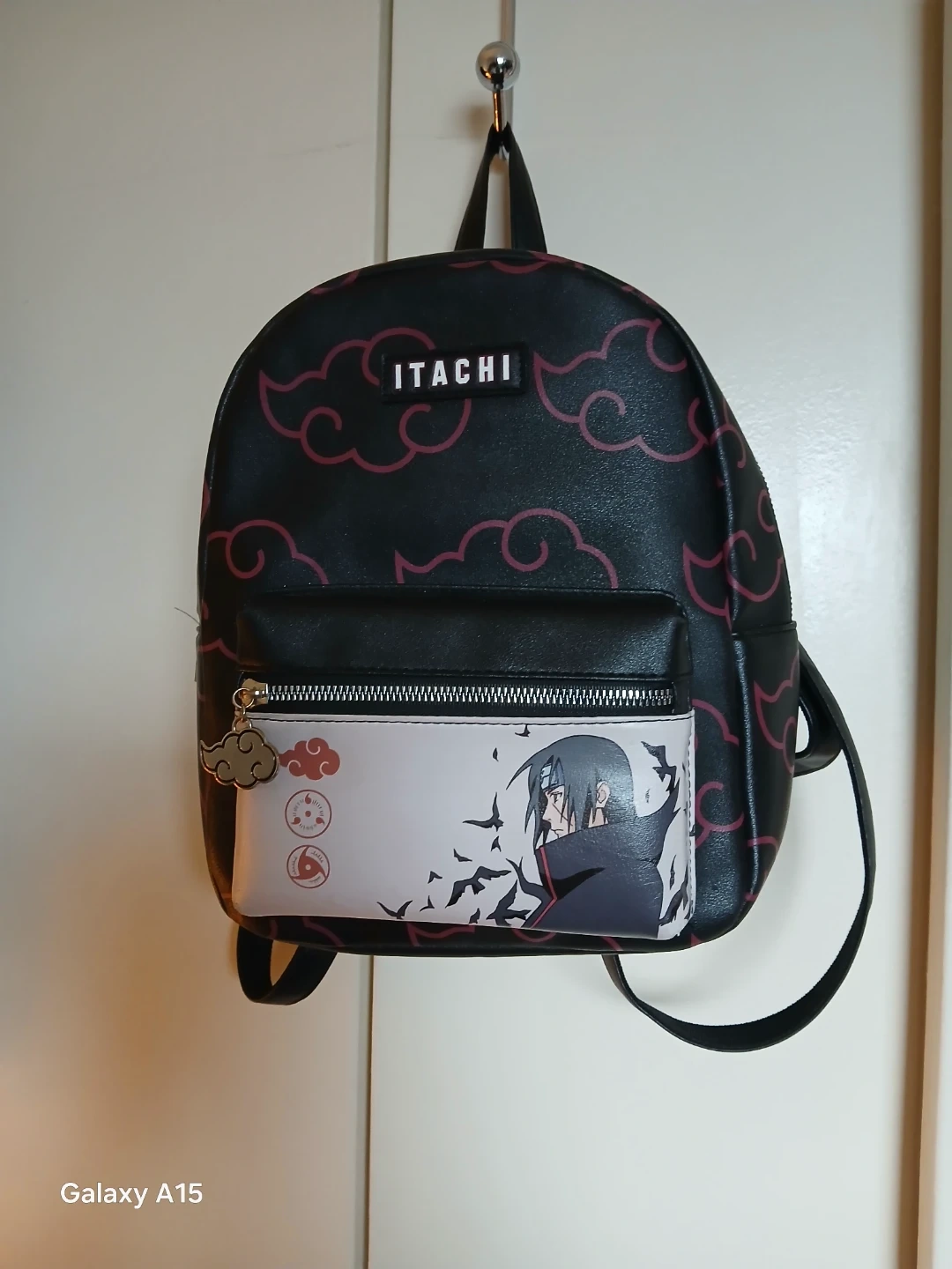 This black mini backpack features a red cloud pattern and an image of Itachi Uchiha from Naruto. It has a front zippered pocket and a cloud zipper charm. Made with faux leather material.