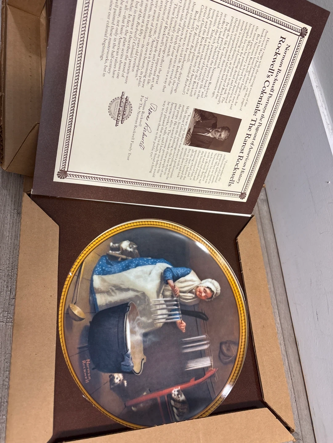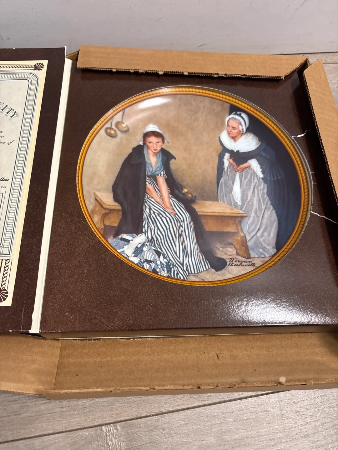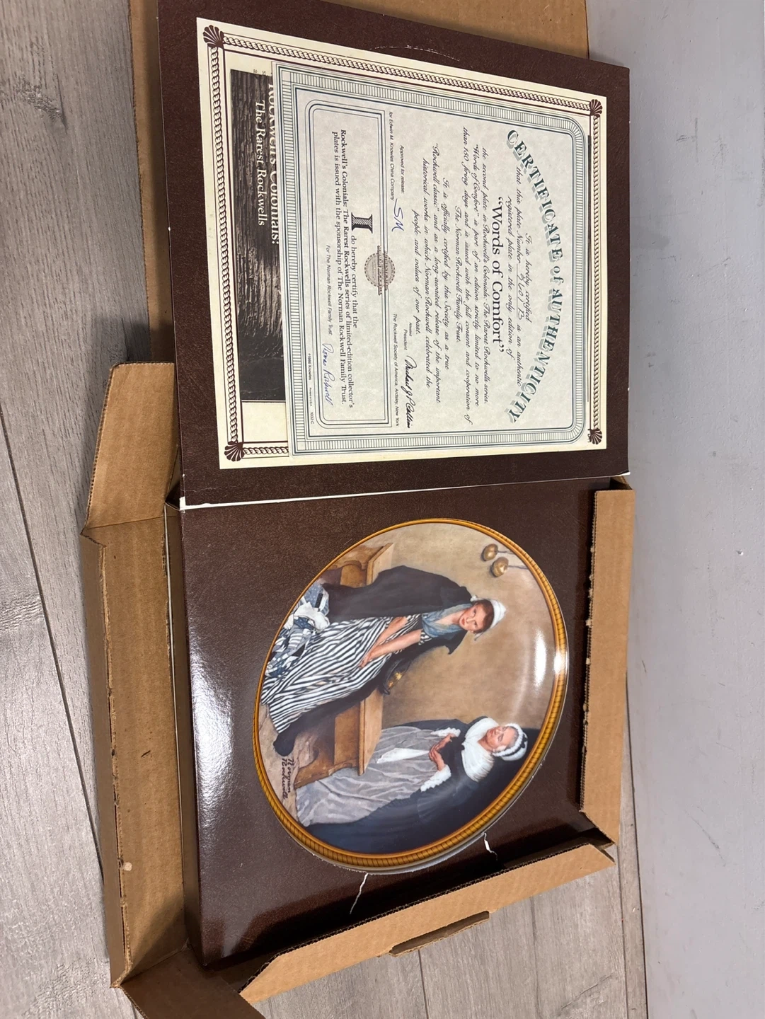 This is the "Words of Comfort" collector plate by Edwin M. Knowles. It's part of the "Norman Rockwell's Colonialists" series. The plate comes with its original certificate of authenticity. This piece would appeal to collectors of Rockwell's art.