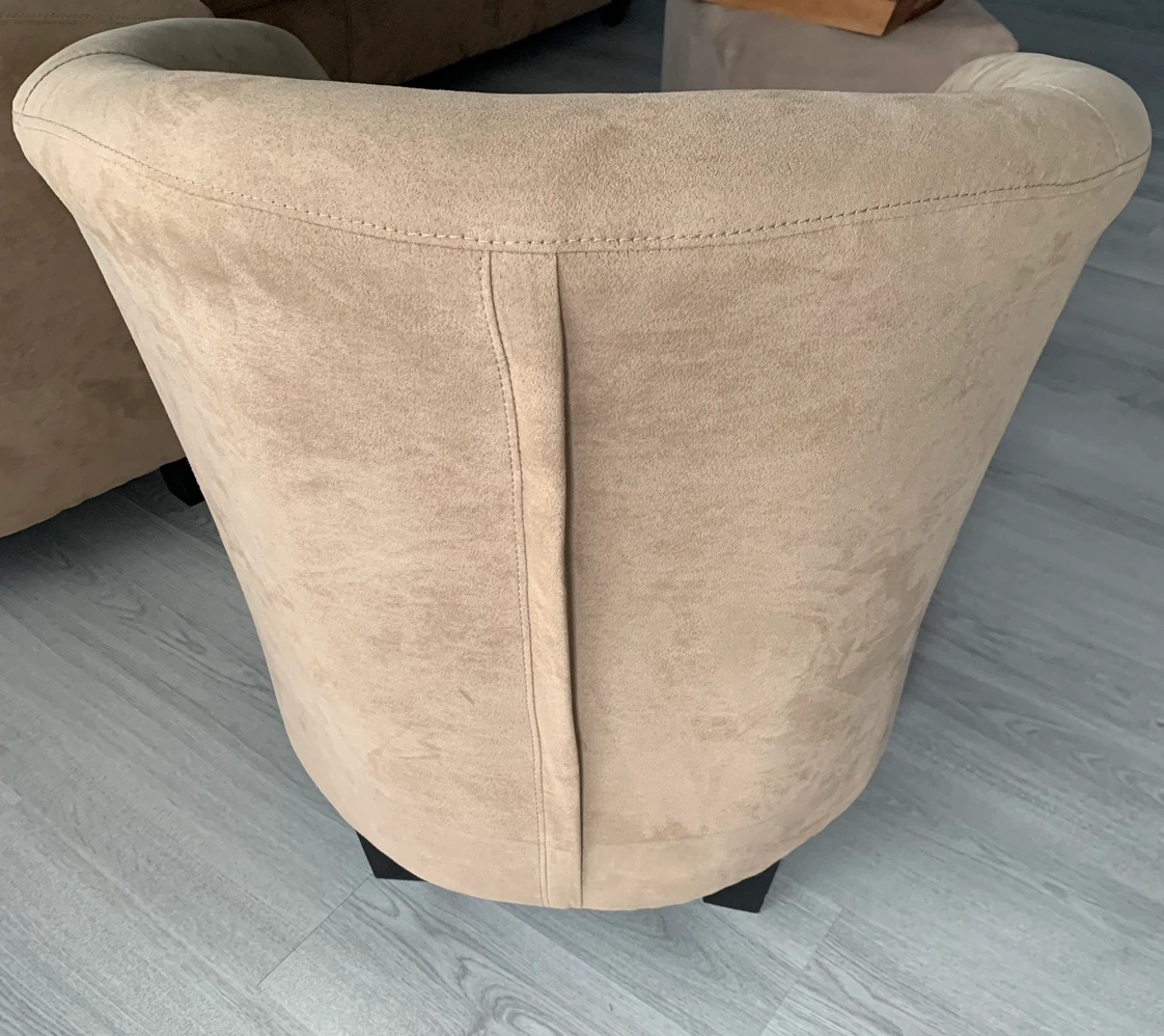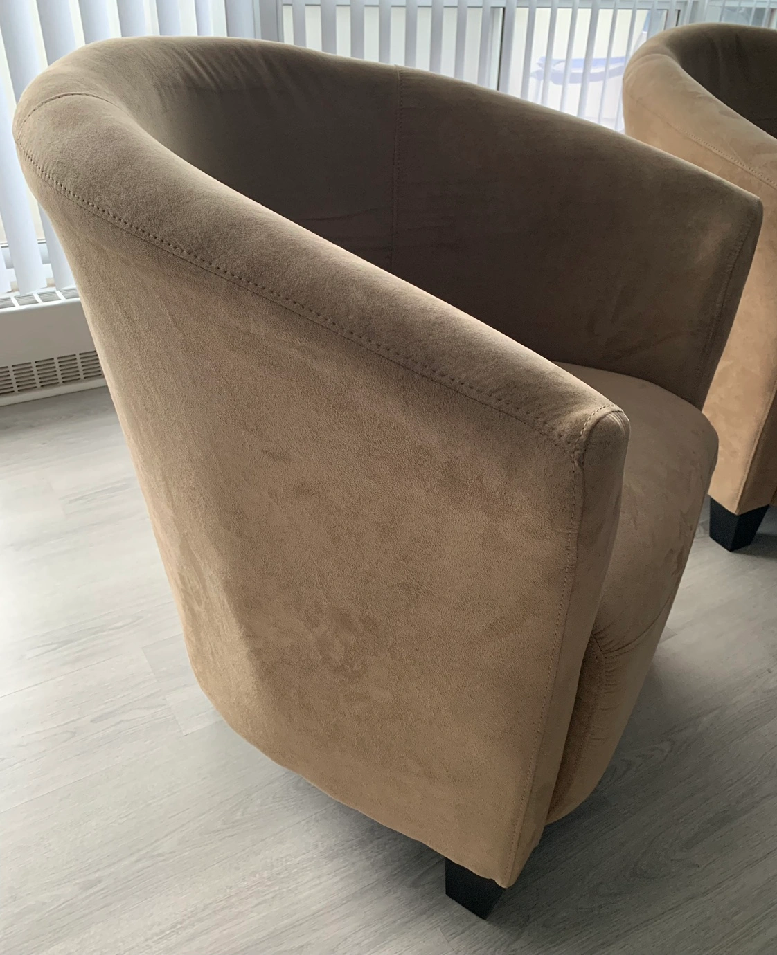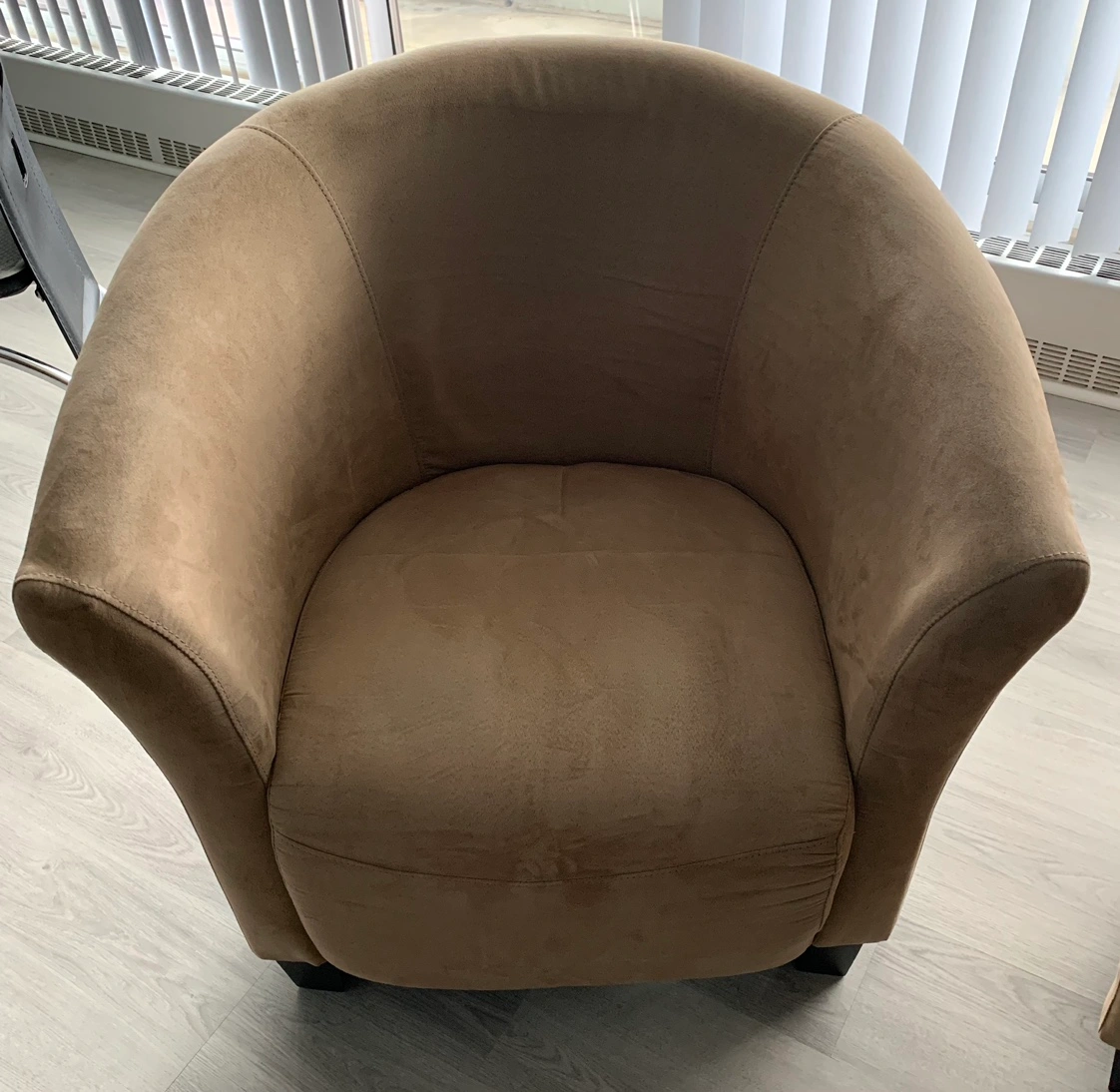 150Beige, comfortable armchair with black legs. Perfect for a living room or office. Originally from The Brick. This chair is in very good condition. It has no damage or stains. Easy to clean. I have two identical chairs. Can give good price. Pickup any day. Need a car. No delivery. Cash only. Text for more info.