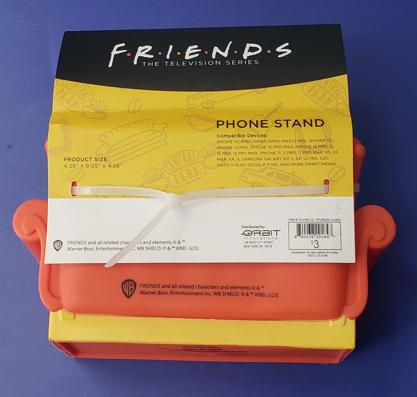 This phone stand is designed like the iconic couch from the Friends TV series' Central Perk cafe. It supports various iPhone and Android models. The stand features a colorful graphic insert with motifs from the show. Brand new, cash only pickup in Queens NY