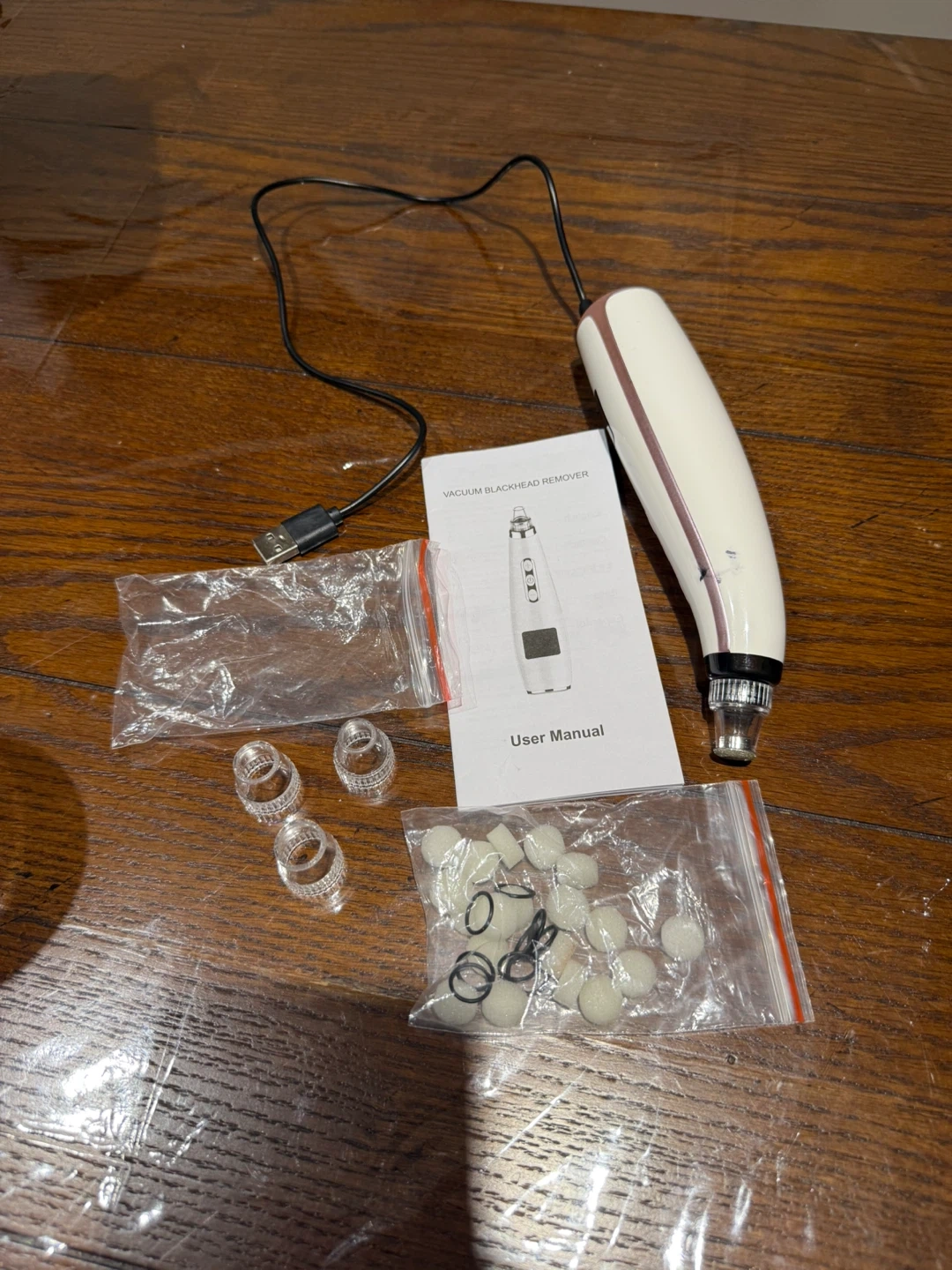 Comes with USB charging cable, user manual, multiple interchangeable suction heads, and filter sponges.