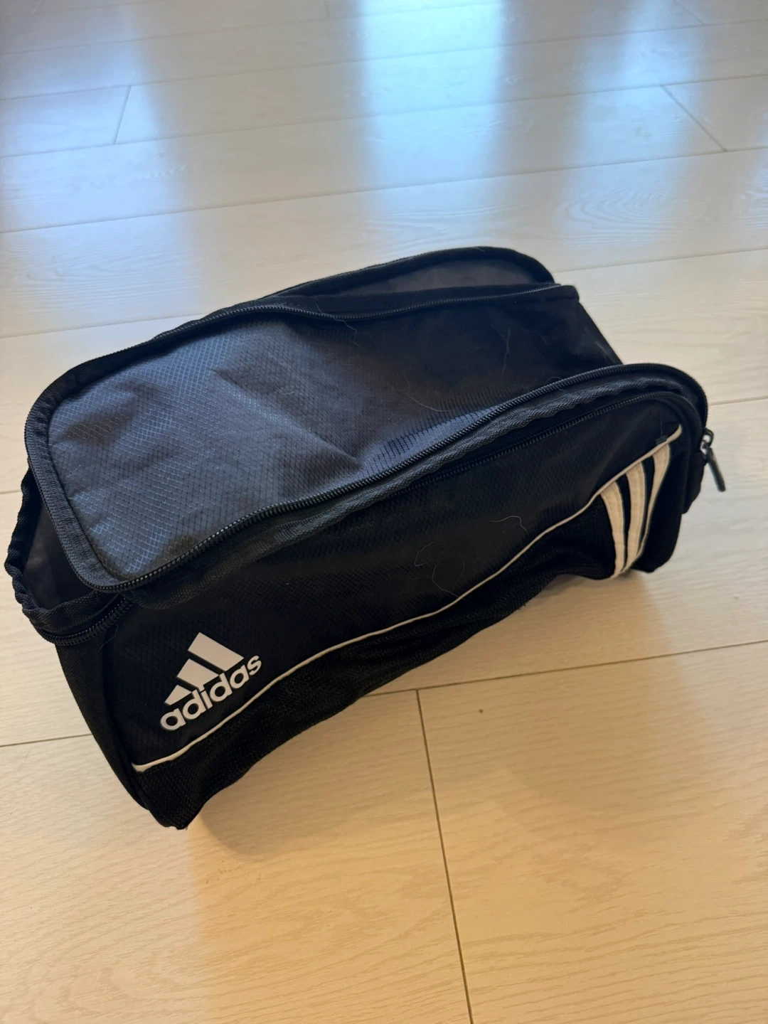 Black Adidas shoe bag with white stripes. Features a zippered compartment. Great for keeping your shoes separate in your gym bag!
