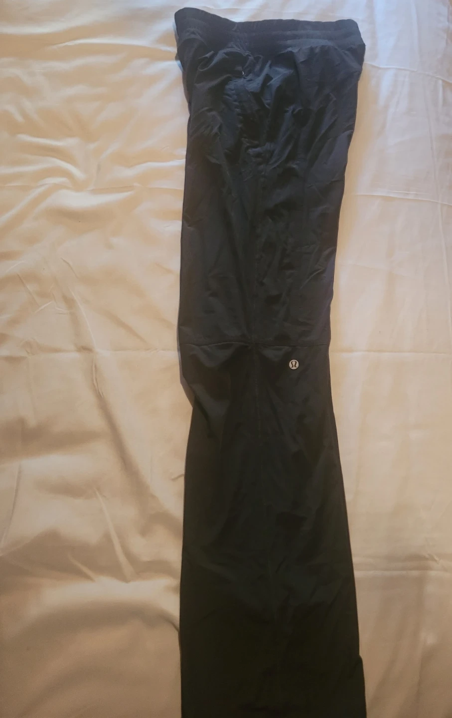 These are Lululemon running pants in black. They feature an elastic waistband. These pants are ideal for athletic activities.
