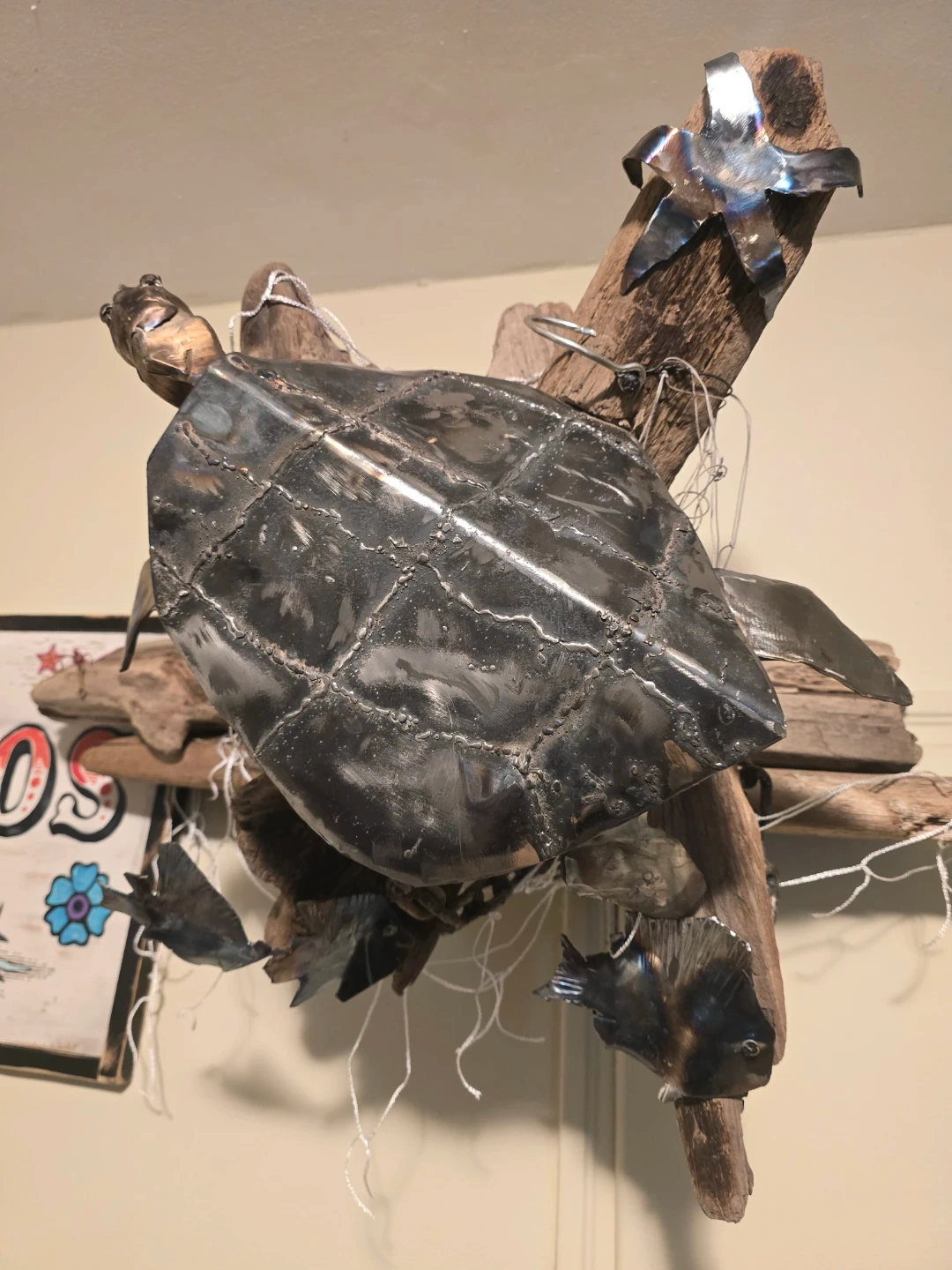 A unique handcrafted sculpture featuring a metal turtle and small fish, mounted on natural driftwood. This piece adds a rustic and nautical touch to any space. It's a conversation starter!