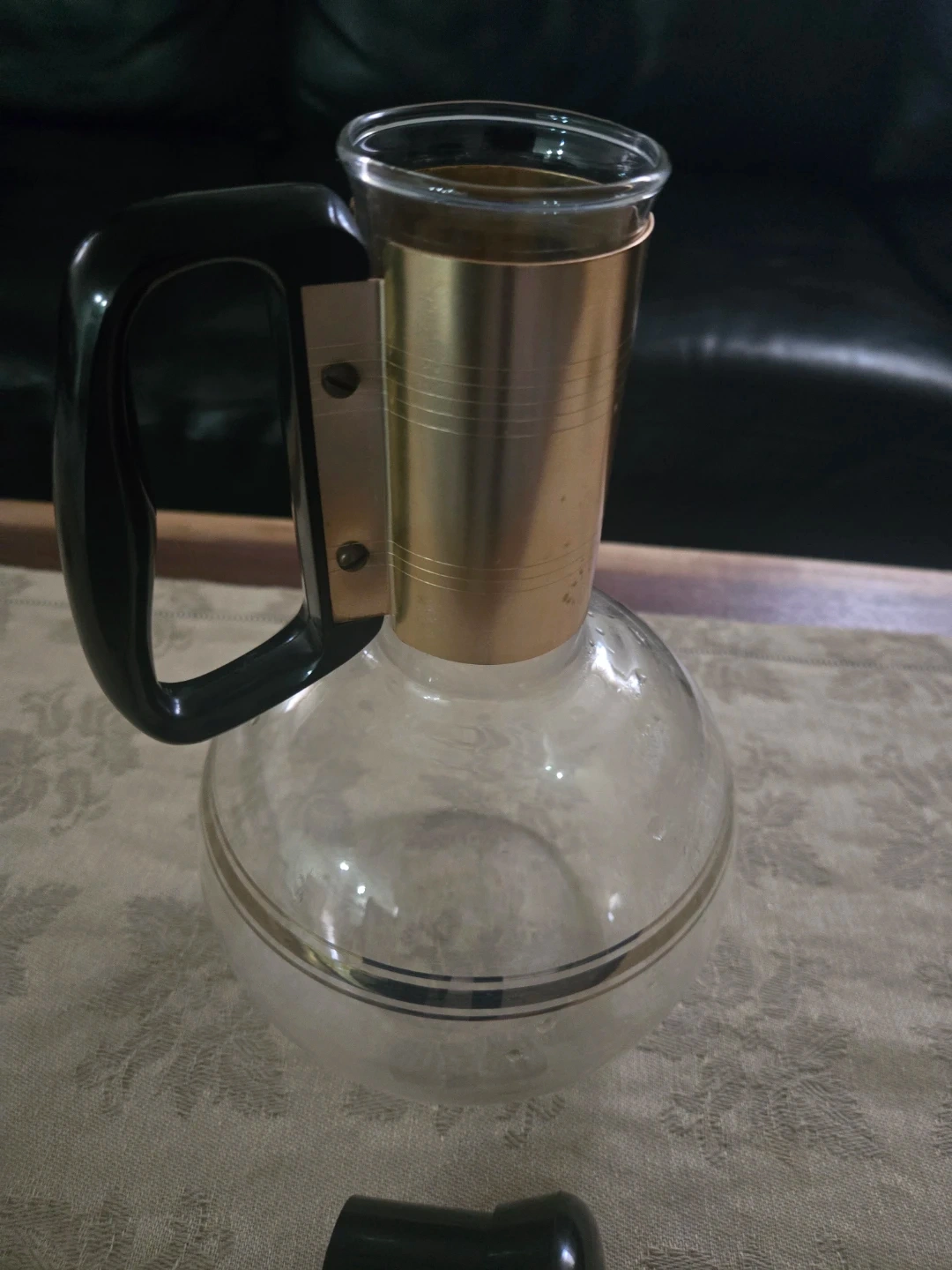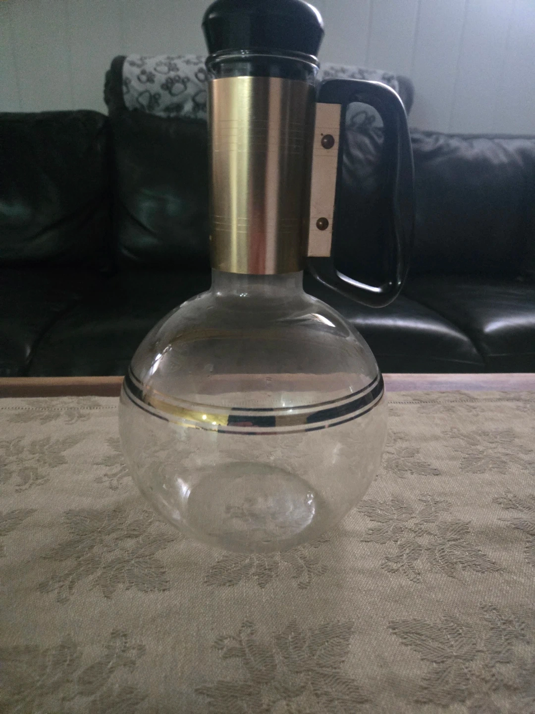 This vintage Pyrex carafe is made of clear glass with a gold trim design. It features a black plastic handle and includes a matching black stopper lid. Perfect for serving beverages at a retro-themed gathering! Made in U.S.A