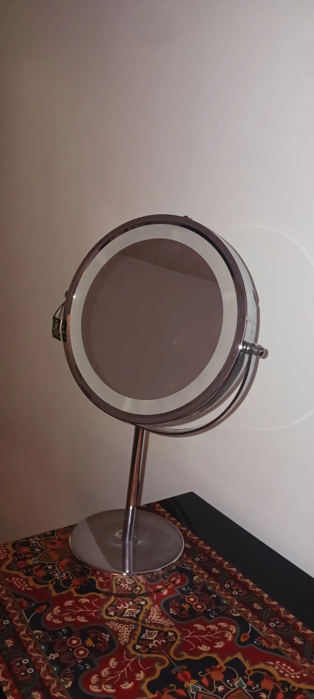 This is a Danielle Creations lighted makeup mirror. It features a bright LED ring light. This mirror is perfect for applying makeup and grooming tasks.