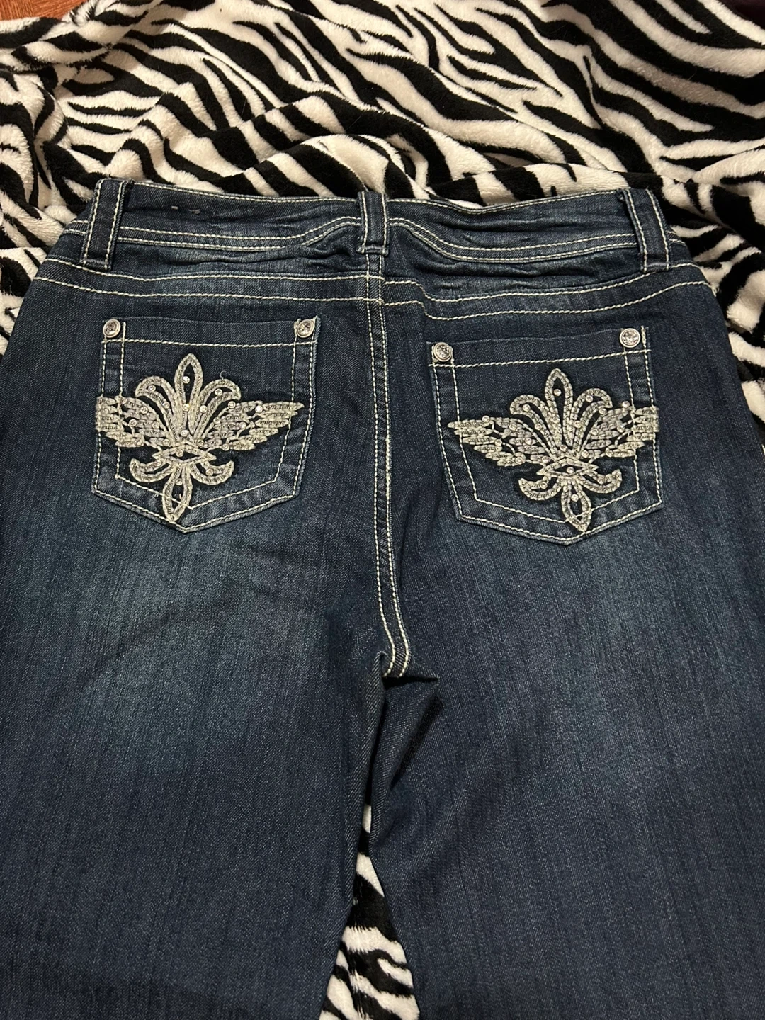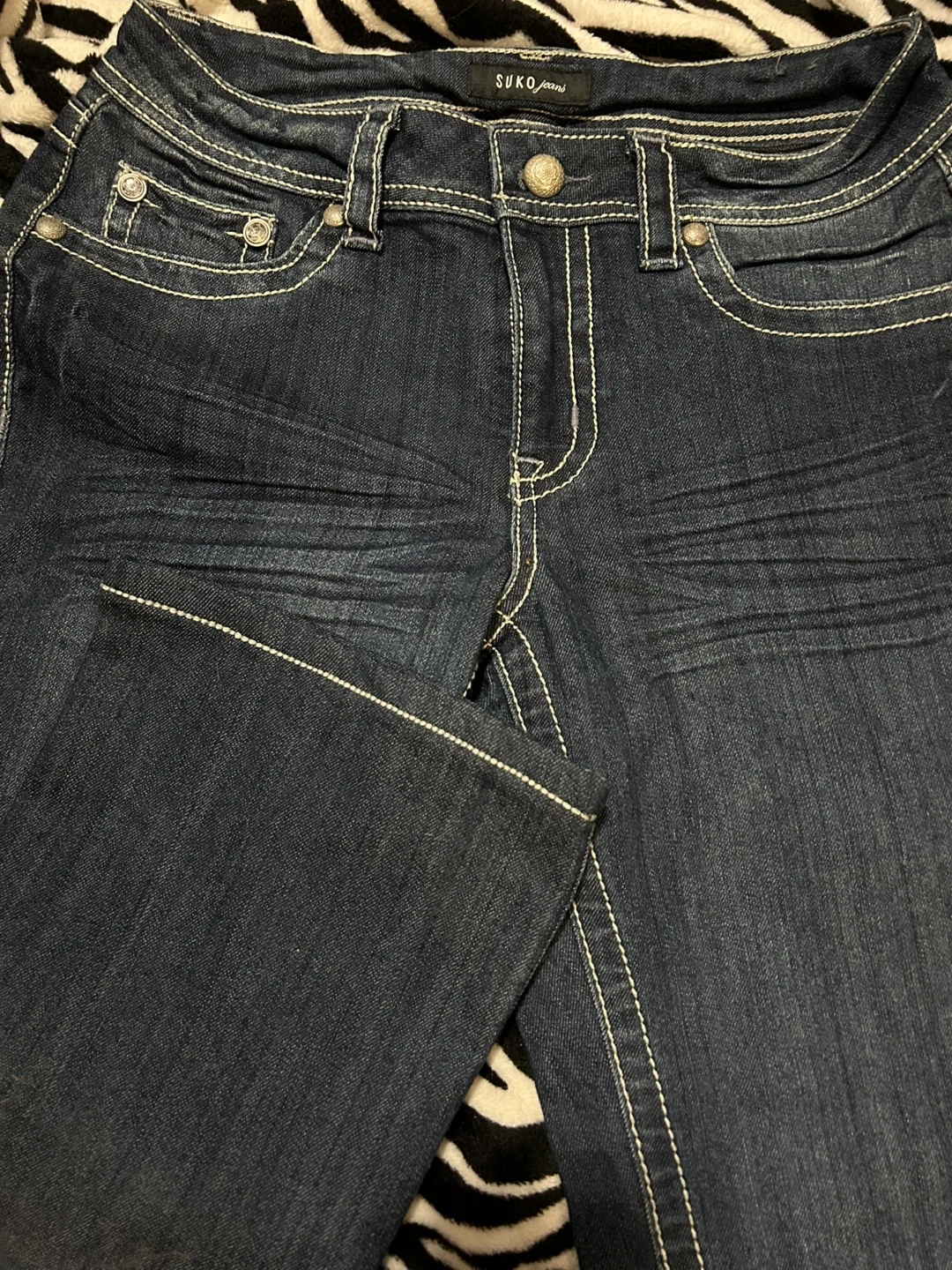 73Selling a pair of SUKO jeans in size 8! They're a dark wash with decorative stitching and embellishments on the back pockets.
