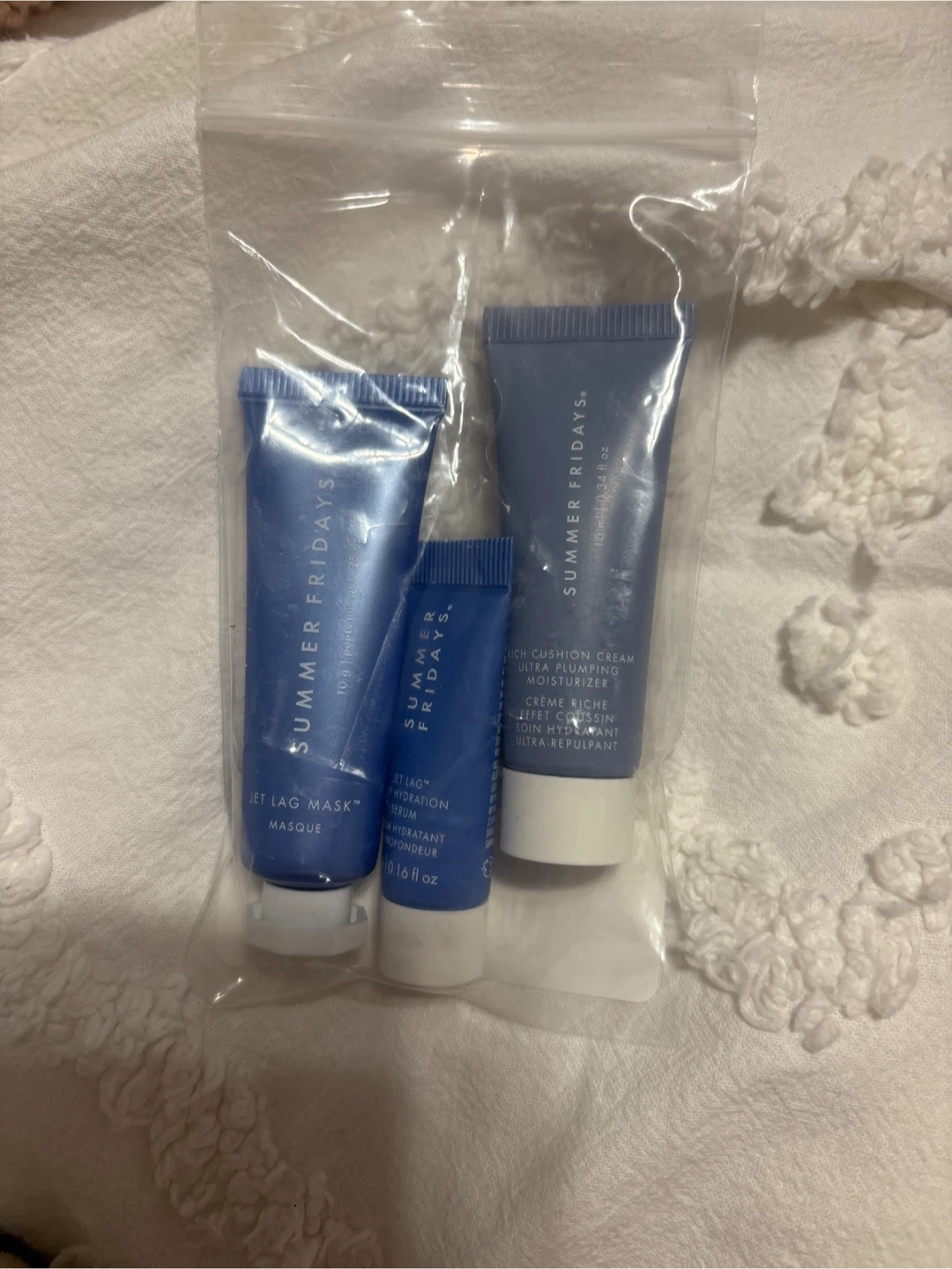 313Selling a Summer Fridays travel-sized skincare set! Includes the Jet Lag Mask, Jet Lag Hydration Serum, and Rich Cushion Cream Ultra Plumping Moisturizer. Perfect for trying out these products or for travel