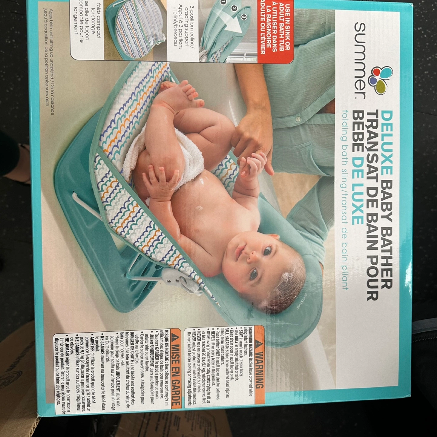 64Folding baby bath sling. Three-position recline. Compact for storage. Use in sink or adult bathtub.