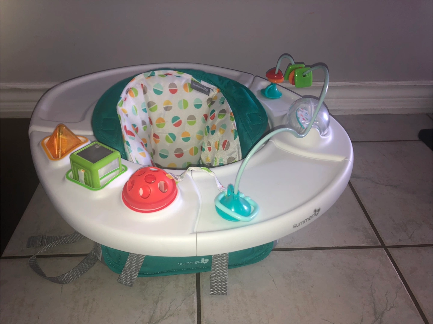 Selling a Summer Infant Pop 'N Jump Activity Center. It's in great condition and ready for a new home. This activity center is perfect for keeping your little one entertained and engaged with its various toys and activities. It's lightweight and portable, making it easy to move from room to room or take on the go. Your baby will love bouncing and playing in this fun and stimulating activity center!
