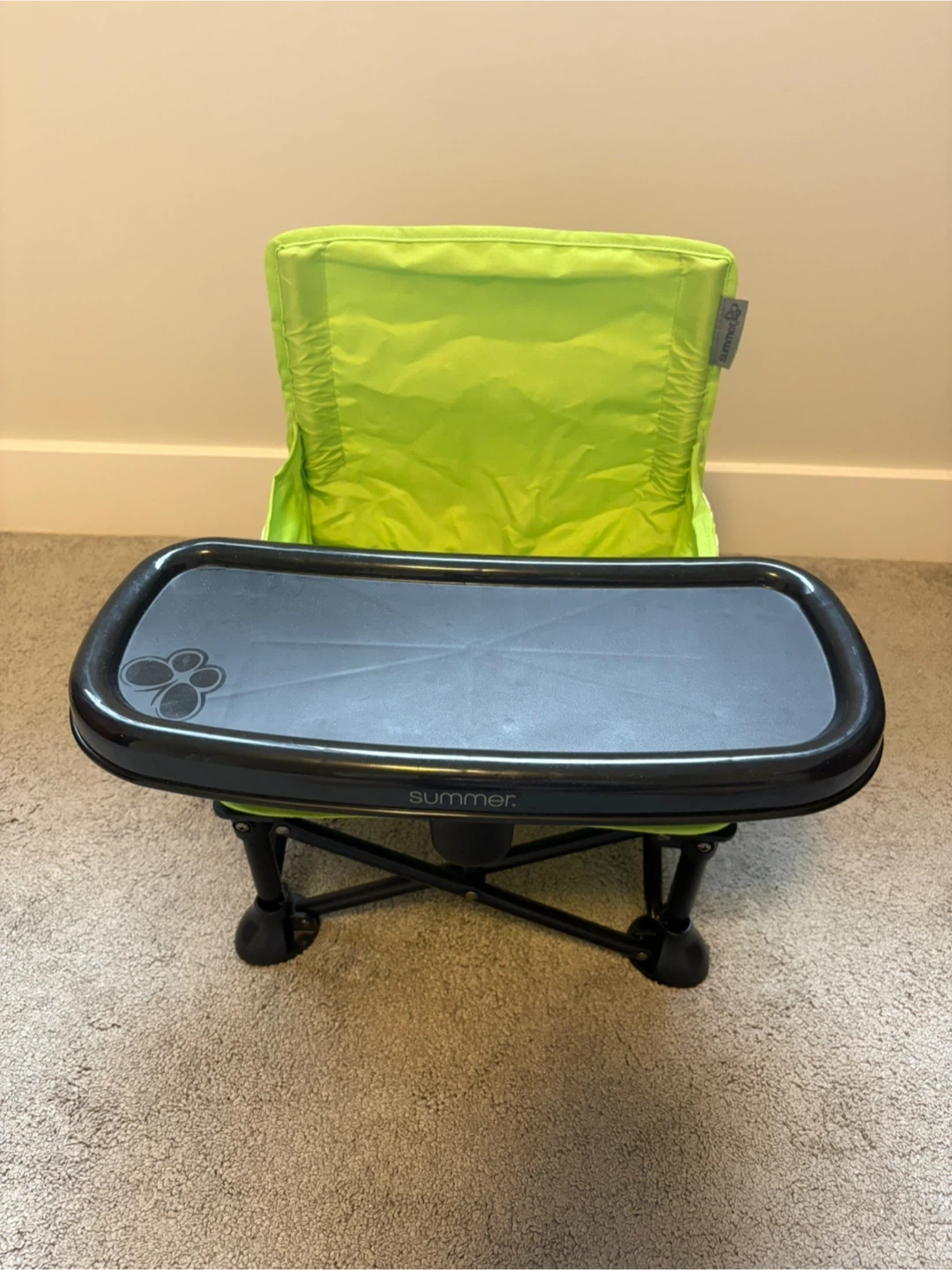 134This portable booster seat is perfect for mealtime on the go! It's in excellent shape and ready for a new little one. It's a Summer Infant Pop & Sit Portable Booster in a vibrant green colour. It's lightweight and easy to fold, making it ideal for travel or small spaces No smoking, no pet home No stains, no damages