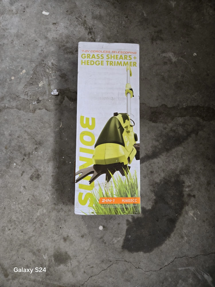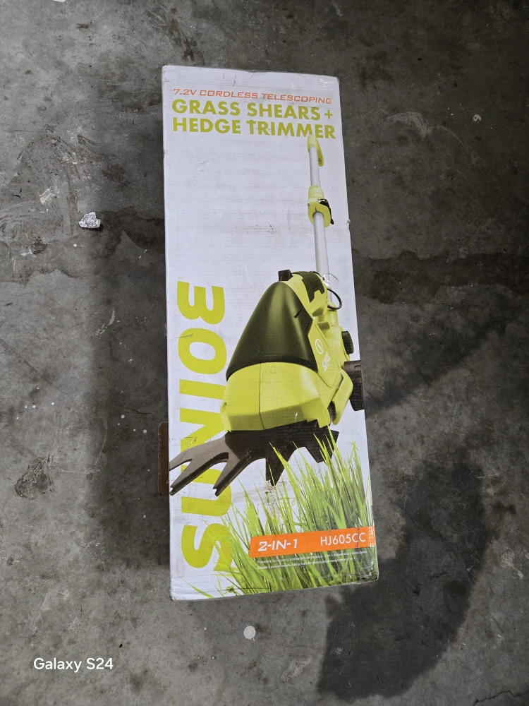 I'm selling a brand new, in box Sun Joe 2-in-1 cordless grass shear and hedge trimmer! It's the HJ605CC model, and it's never been used. The box includes the trimmer itself, ready for your lawn care needs