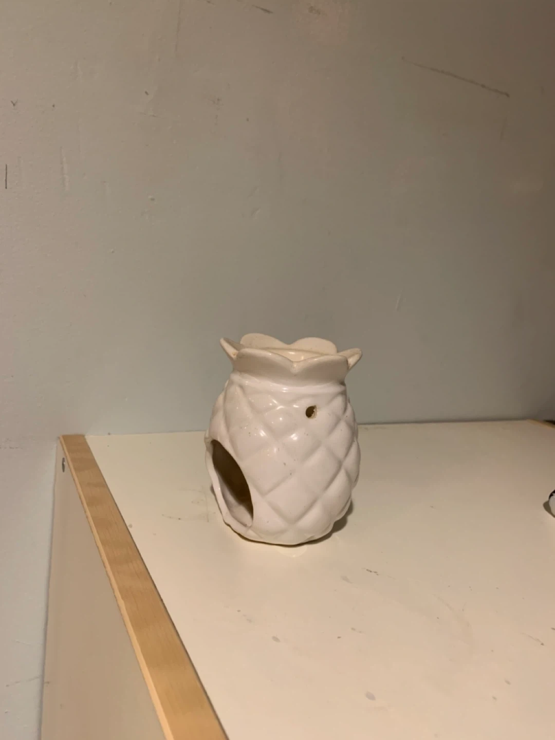 I'm selling a white pineapple-shaped ceramic oil warmer. It's perfect for adding a touch of tropical flair to your space while enjoying your favorite essential oils