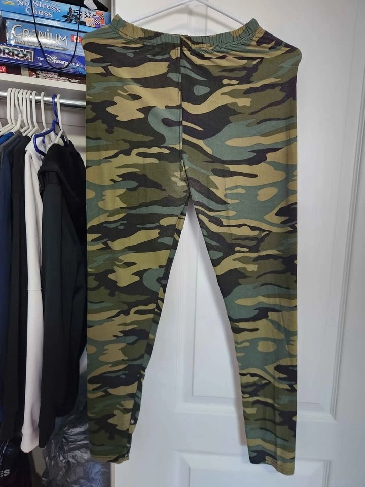 Bundle includes 4 pairs of women's leggings in size M/L. Features camo and black pairs. They are stretchy, comfortable, and in good condition with no rips or stains. Selling as a bundle only.