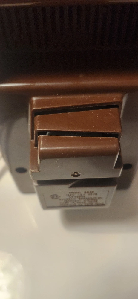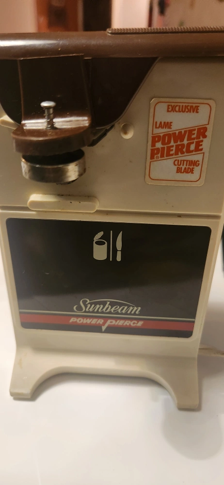 Vintage Sunbeam Power Pierce electric can opener. Includes cord. Brown and white colour. Works with a push button. Has a "Power Pierce" cutting blade.