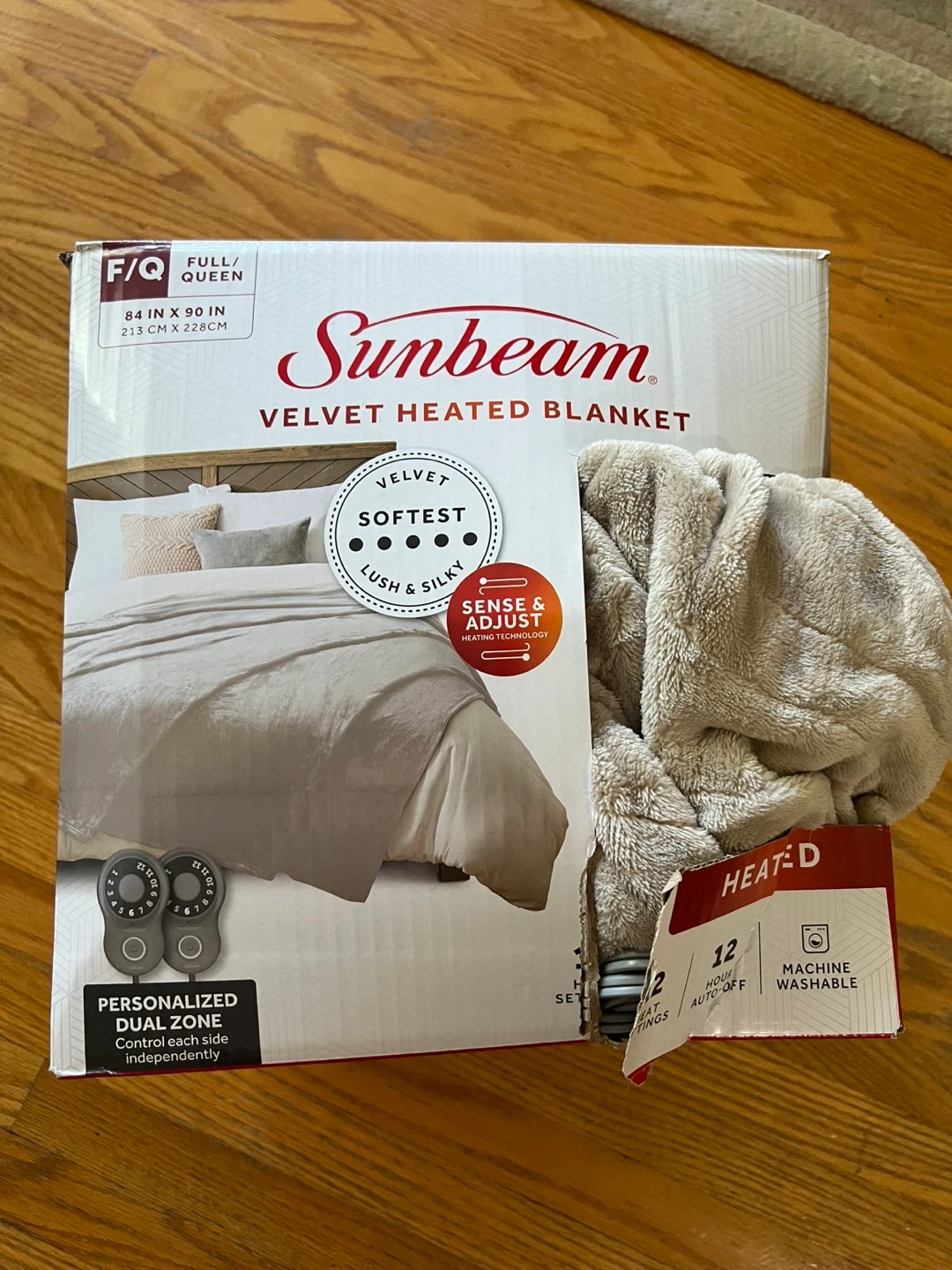 10Snuggle up with this Sunbeam Velvet Heated Blanket in Full/Queen size! The blanket is machine washable and tumble dry safe, making it easy to care for. It also features 12 heat settings and a 12-hour auto-off function for added safety and convenience