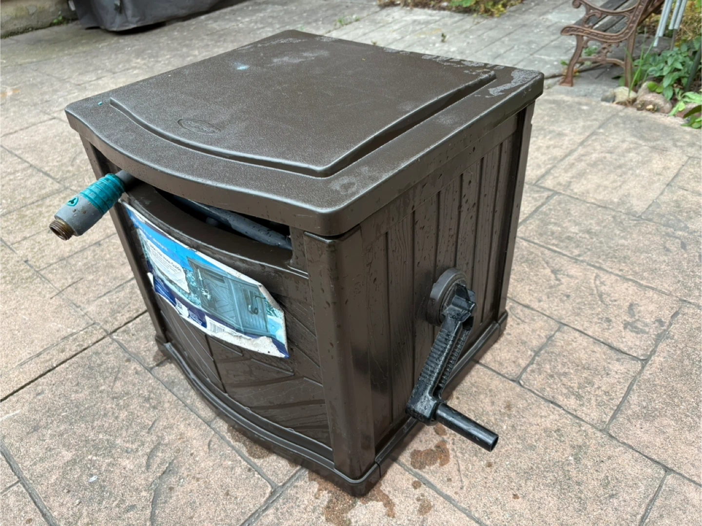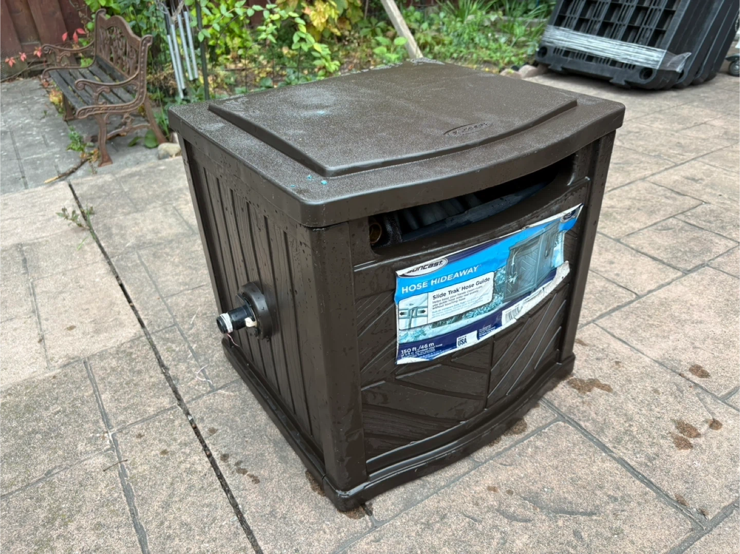 Suncast Hose Hideaway with the Slide Trak Hose Guide. It holds up to 150 ft / 46 m of 5/8 in standard vinyl hose. Hose included/no leaks.