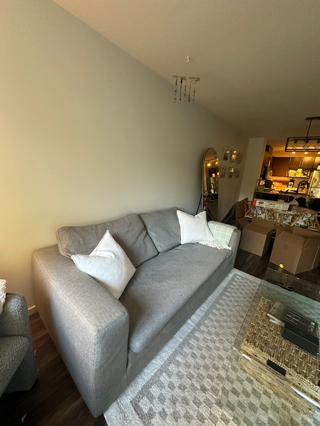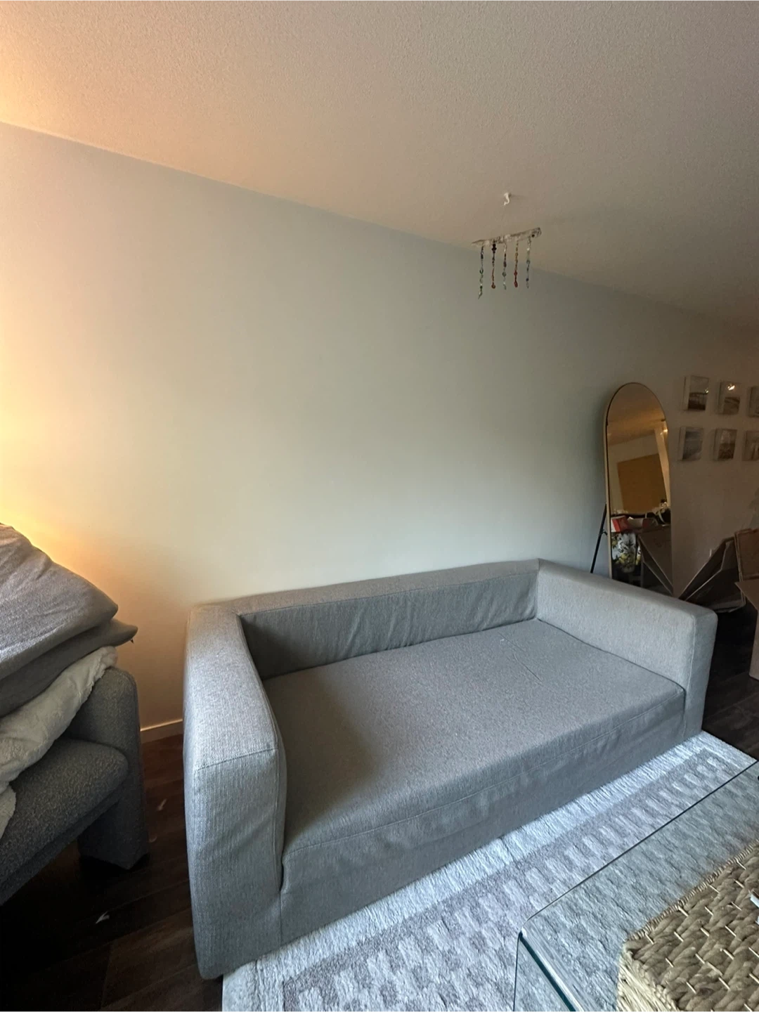 Bought new less than a year ago No stains, rips or tears All cushion covers are removable and washable. 82in long / seat depth 33in / front to back 40in Also comes with two matching throw pillows that are not pictured