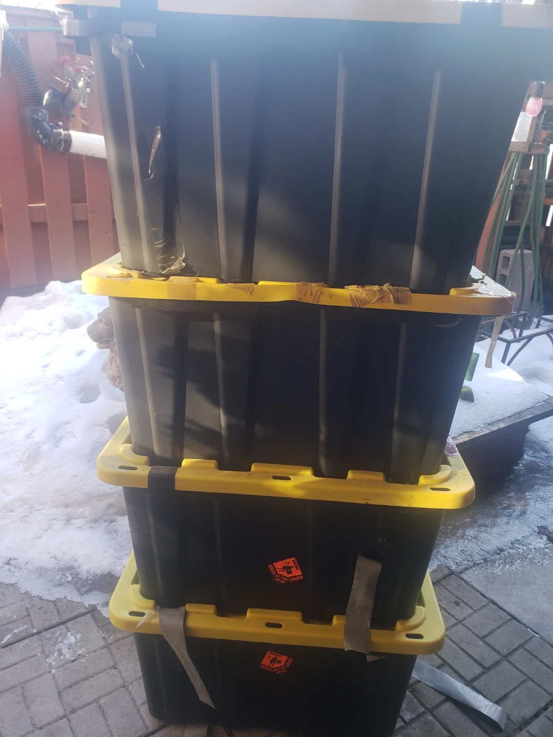 Selling a stack of three black storage totes with yellow lids. Each tote is made of plastic and has a sturdy construction. They're great for organizing garages, basements, or sheds. Some wear and tear visible on one tote's lid. The yellow lids have clips to secure them. Includes orange hazard stickers.