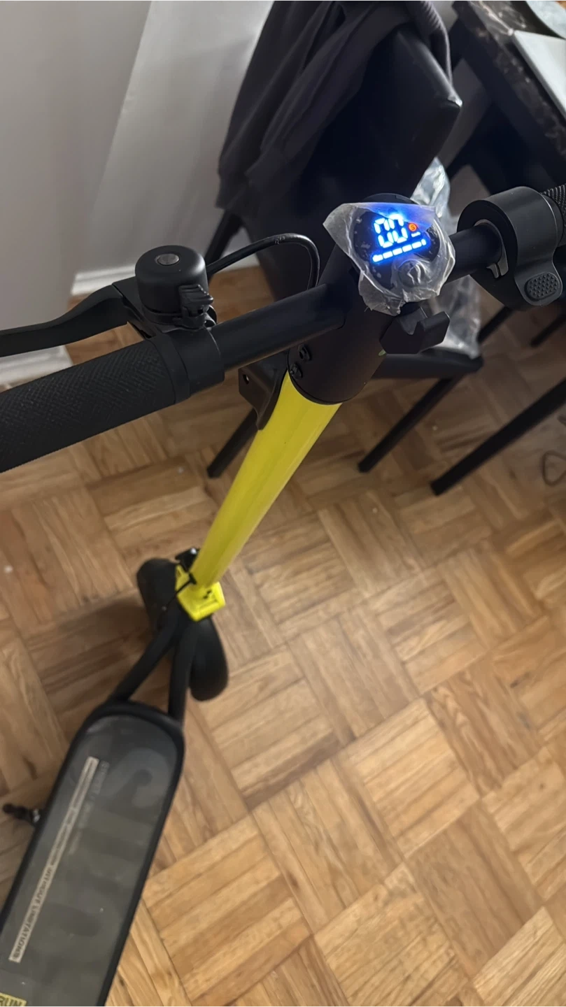 Selling a Suotu ST E500 electric scooter in yellow! It has a front LED light, front drum brake, and rear electric brake for improved security. It also features a brake light for added safety.