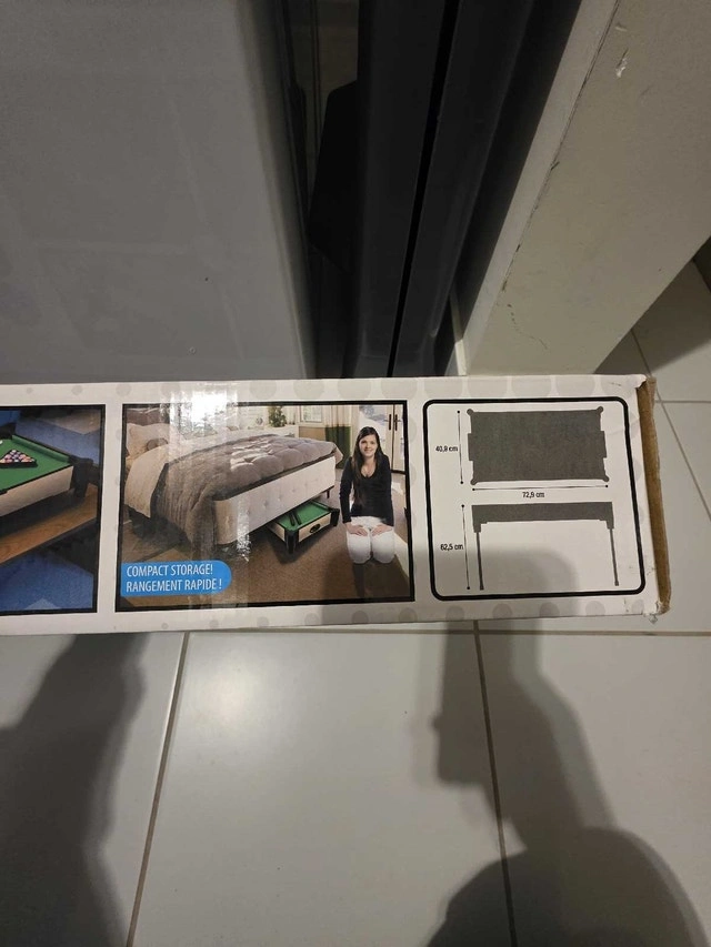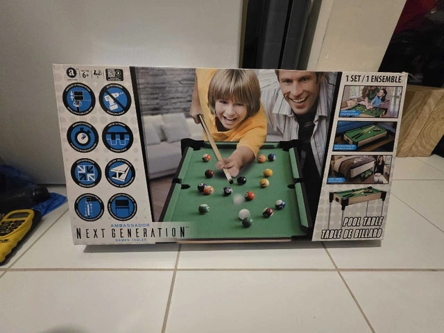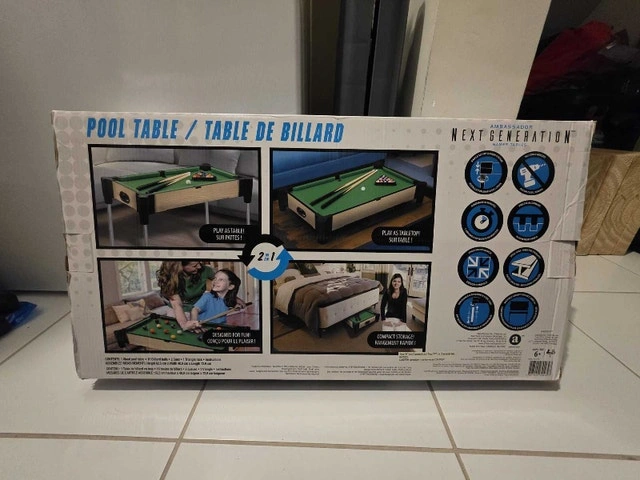 Brand new, unopened ToysRUs Canada Ambassador Games "Next Generation" 27" tabletop pool table. Patented design allows for quick, tool-free assembly in minutes. Features both table and tabletop playing modes, compact storage, and is stable and durable. Includes professional quality UREA balls, 2 wooden cues, and a triangle. Ideal height for kids. Simple set-up corner system, no tools needed. Removable and reversible steel legs. Space saving design. Assembled measurements: Height 62.5cm x Width 40.9cm x Length 72.9cm. Contents: 1 Wood pool table, 16 Billiards balls, 2 cues, 1 Triangle rack, Instructions.