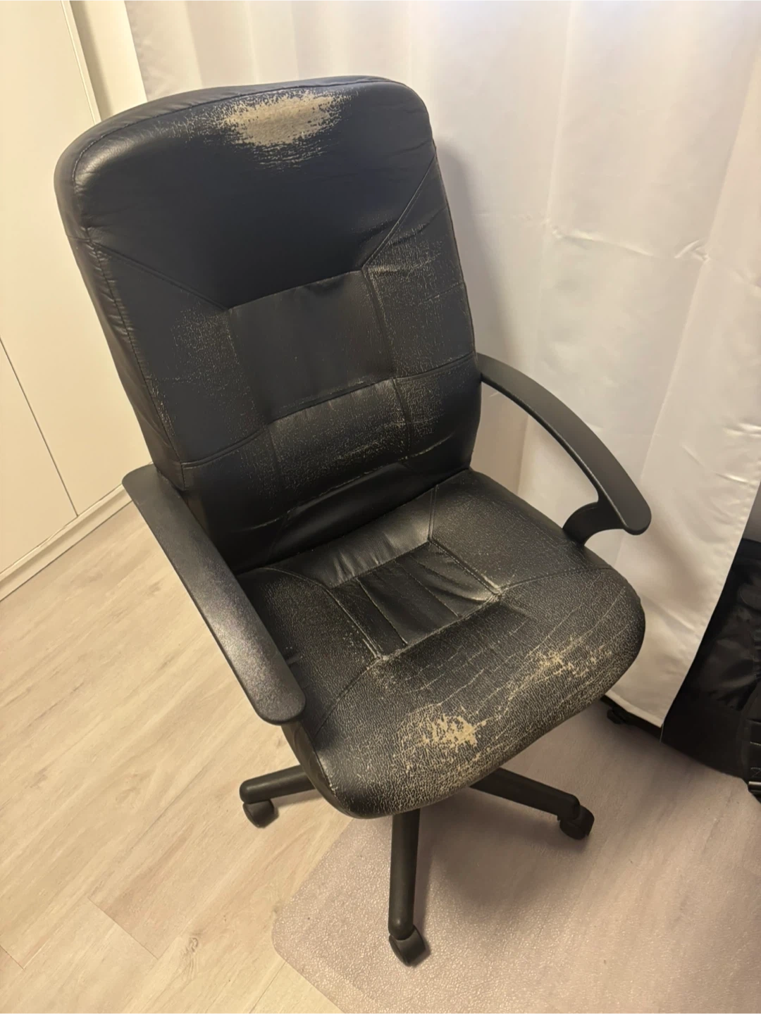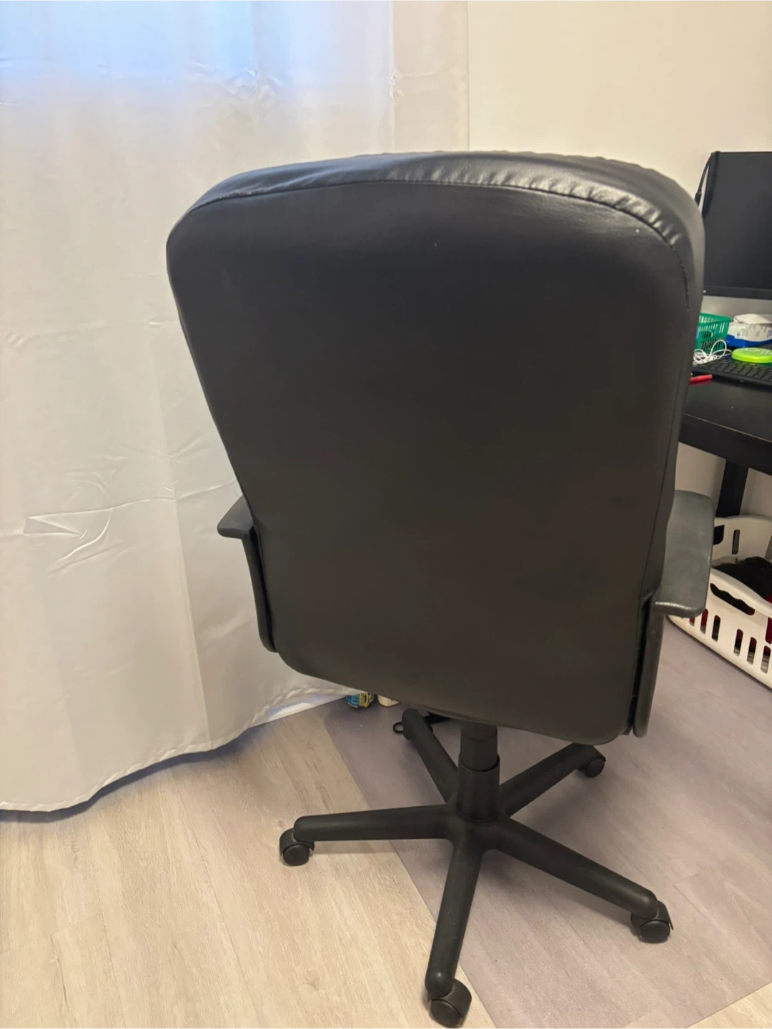 82Selling my office chair in good working condition. ✅ Adjustable height and smooth 360° swivel ✅ Comfortable padded back and seat ✅ Sturdy build with rolling wheels ⚠️ Some wear on the faux leather (as shown in pictures) – purely cosmetic, doesn’t affect comfort or use. Perfect for home office, study, or gaming setup. 💰 Asking Price: $200
